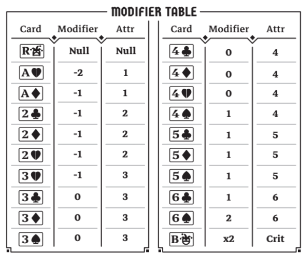 I have been reminded recently that poker is still a thing (wildly popular too, who knew?), and most everyone owns at least one standard poker deck. So I thought, what if we map the modifier deck to a deck of traditional playing cards and provide clear representation so people can still use cards, but they don’t need a special product.