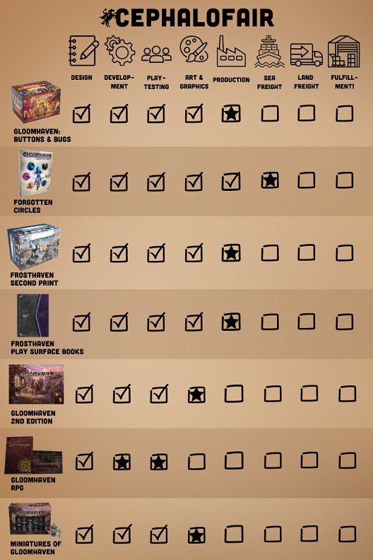 Same story here. The last piece of this was designing a box to put all the books in, because the books were too big to package any other way. So that is finished, and the play surface books are now in production and will be shipped alongside Frosthaven and Forgotten Circles. These will likely be the last piece to make it out of production, but Chris and Price are working on our shipping plan next week and will be eliminating as much unnecessary waiting and downtime as possible.