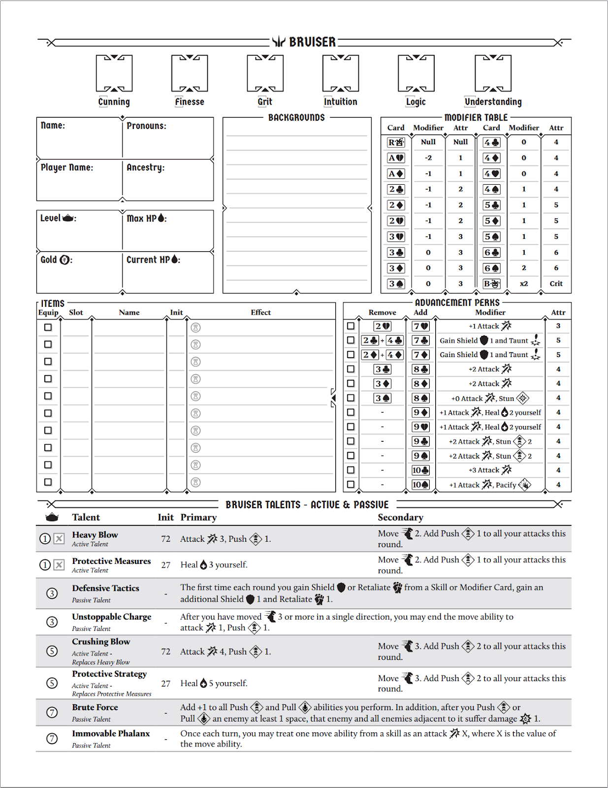 - Every class has a perk list explaining which cards to add or remove to make up the Perk. We’ve already accounted for the additional cognitive load that Perks will present (for example, a 7 of clubs is different for every class), and have created class specific character sheets that include both the base modifier deck mapping and the Perk mapping. As seen below:
