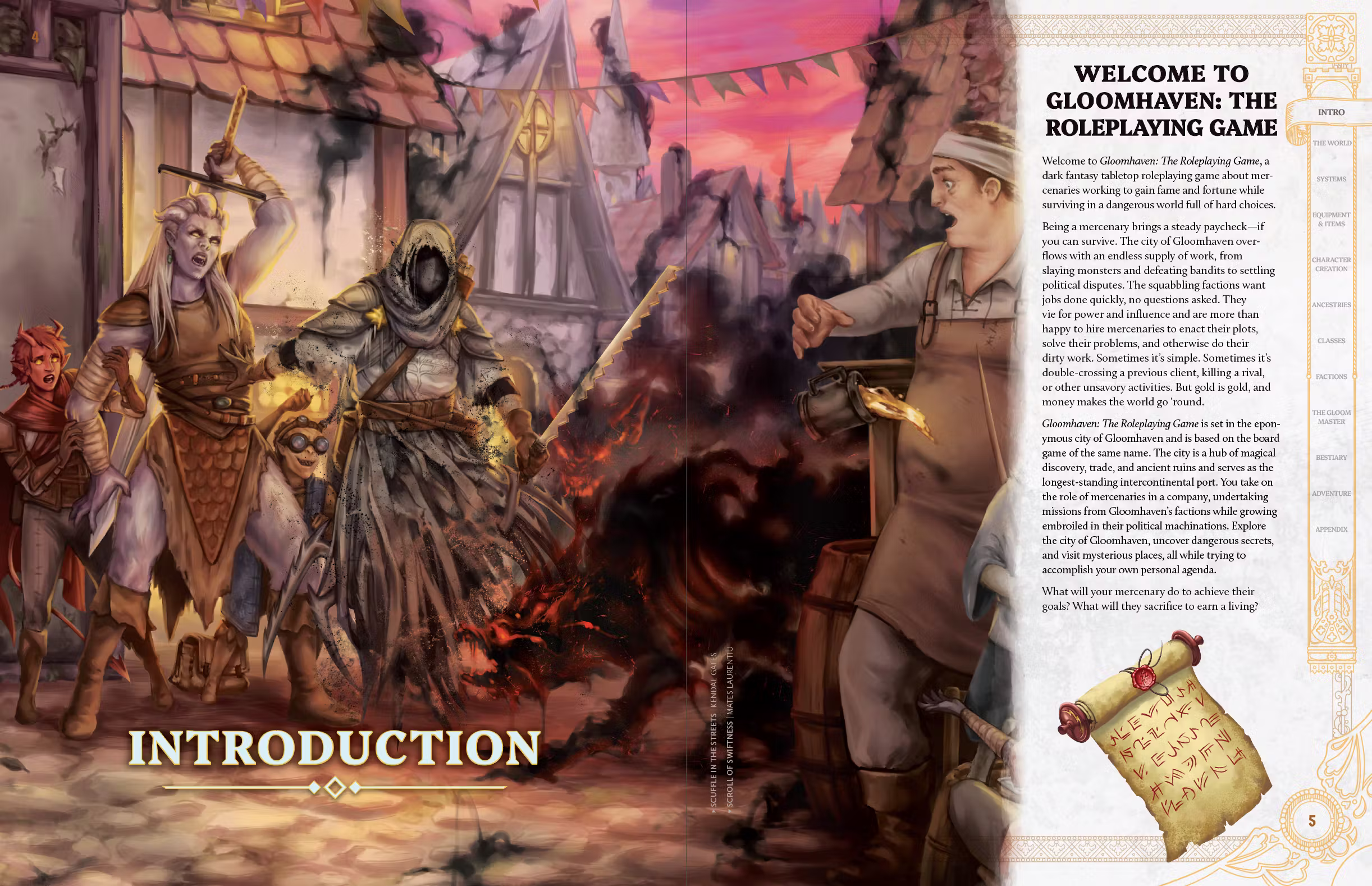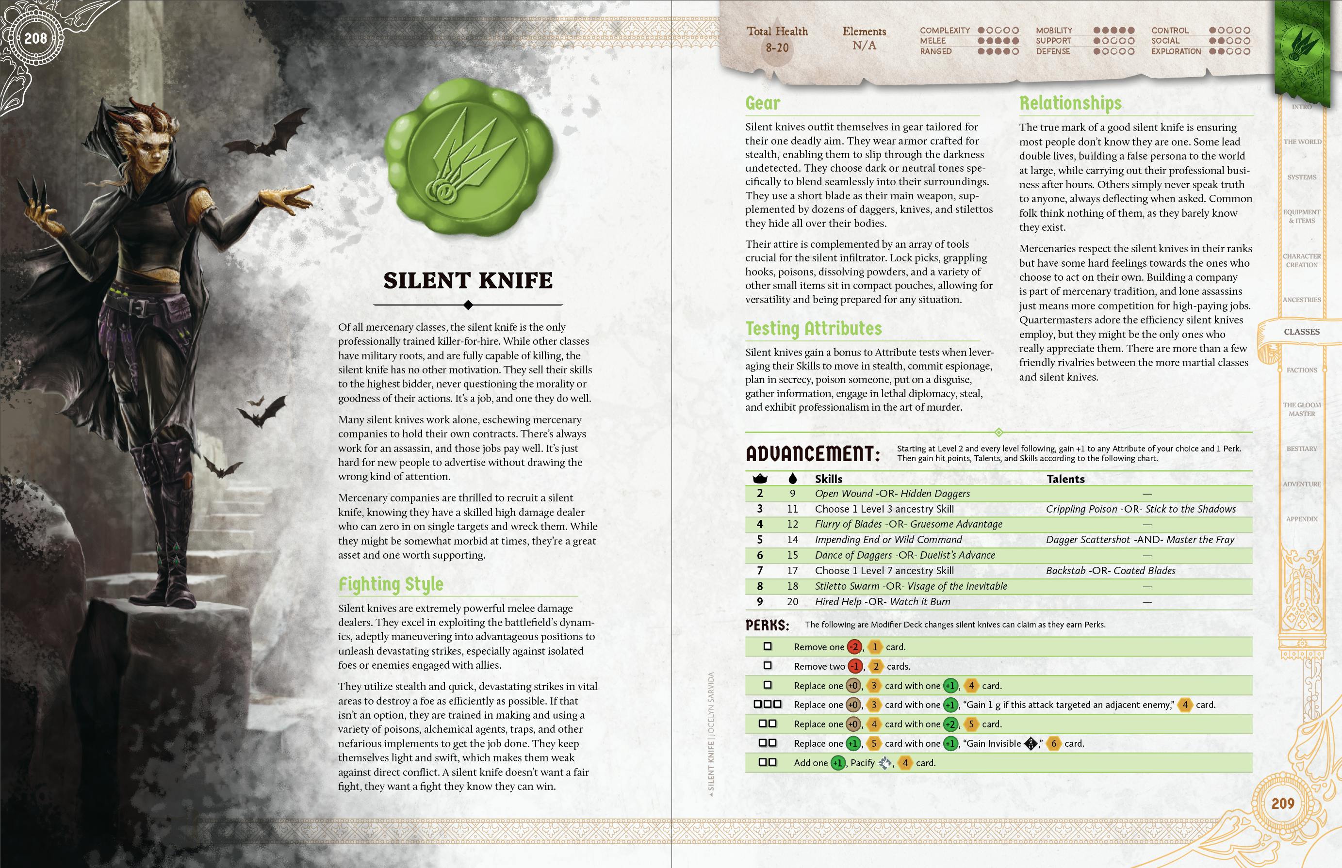 One of the things we’re most excited about with this system is the ability to mix and match ancestries and classes for a more customized mercenary. The first pages for each class and ancestry have been given special attention by our design team to encompass all the basics on one spread. Like many of the book’s key art illustrations, Jocelyn Sarvida’s valrath silent knife illustration gives us a glimpse of an individual from the world of Gloomhaven we’ve not seen before.