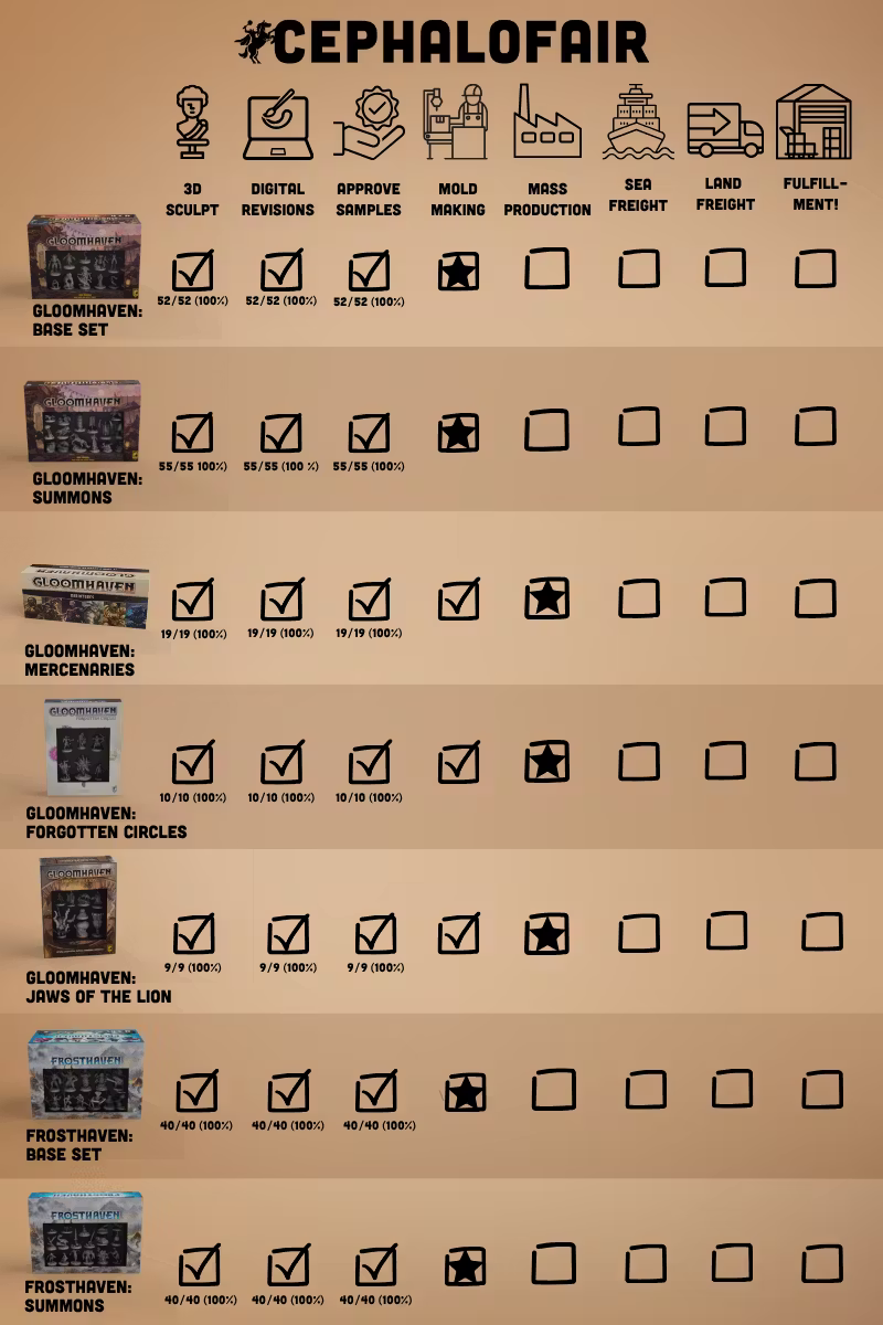 We completed our final round of approvals for digital modification, which means Gloomhaven, Gloomhaven: Summons, Frosthaven, & Frosthaven: Summons are all officially entering steel mold production.