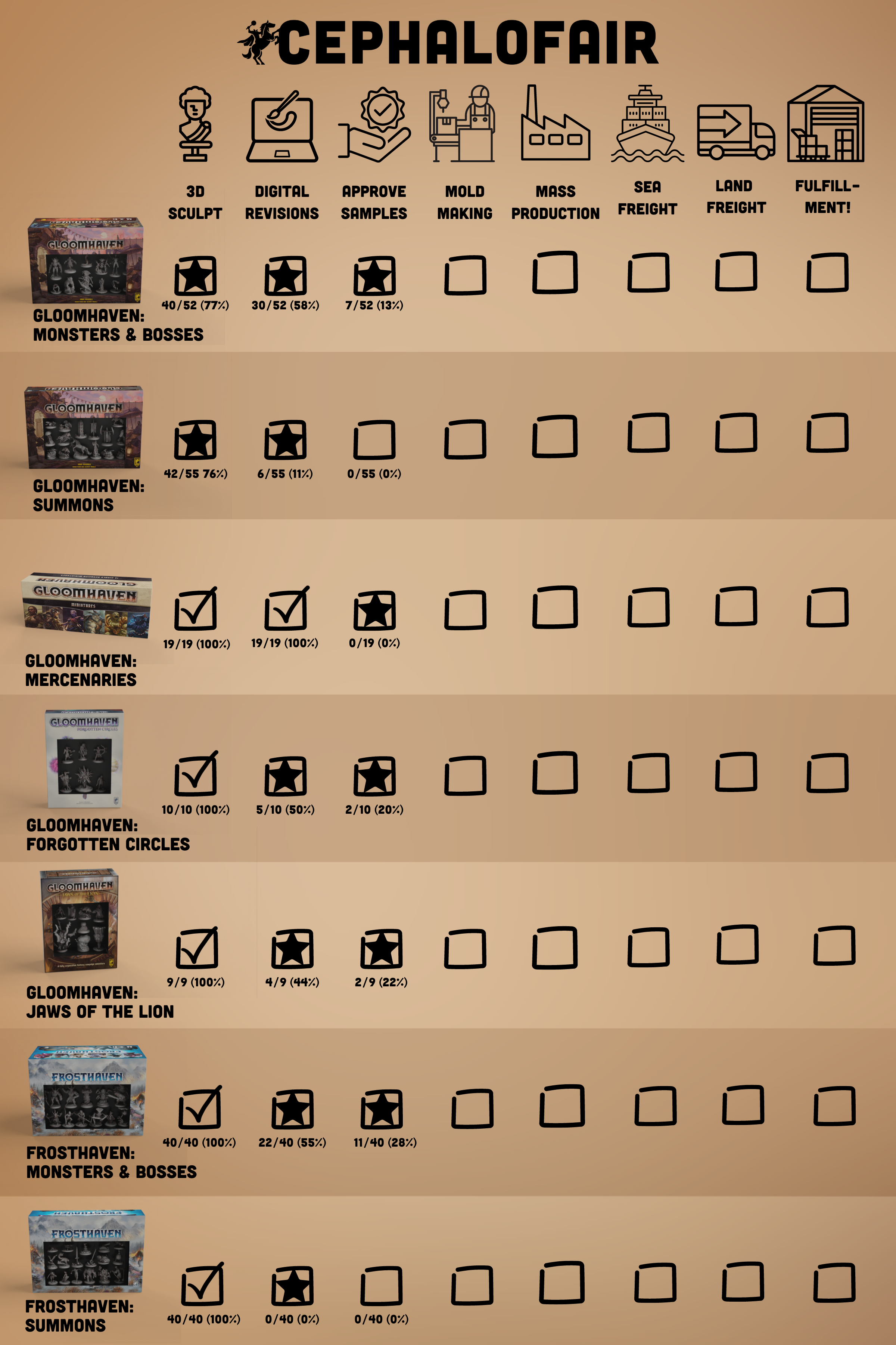 Now that the last of the sculpts are coming in, we've been able to more effectively communicate with the factory about dates and get things moving faster on that end. I know you haven't gotten a good update on miniatures since March, and I am sorry about that, but going forward, expect regular updates about the progress and what is going on.