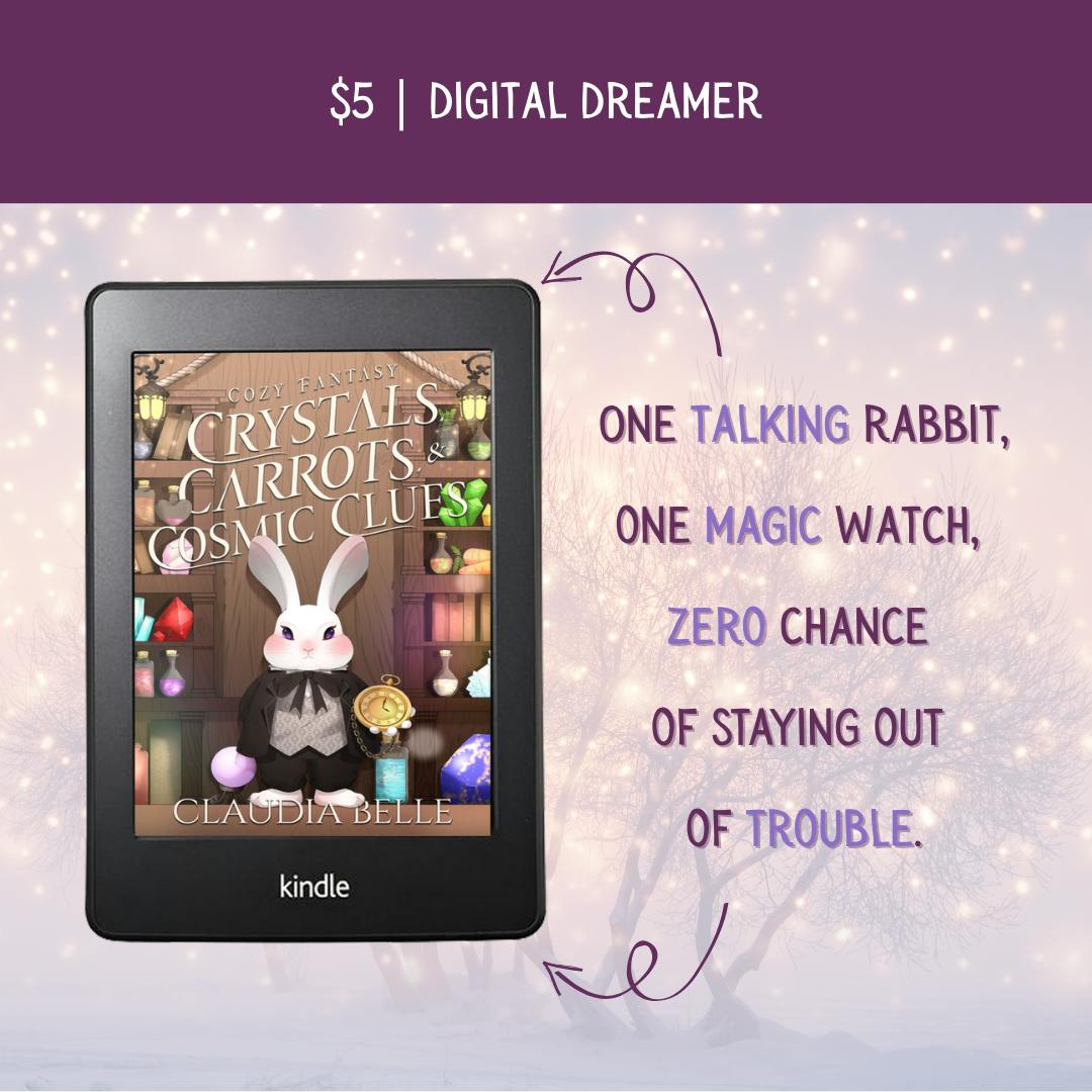 Crystals, Carrots & Cosmic Clues is a cozy-fantasy romp where the tea is piping, the intuition is unsolicited, and the rabbit wears a tuxedo.