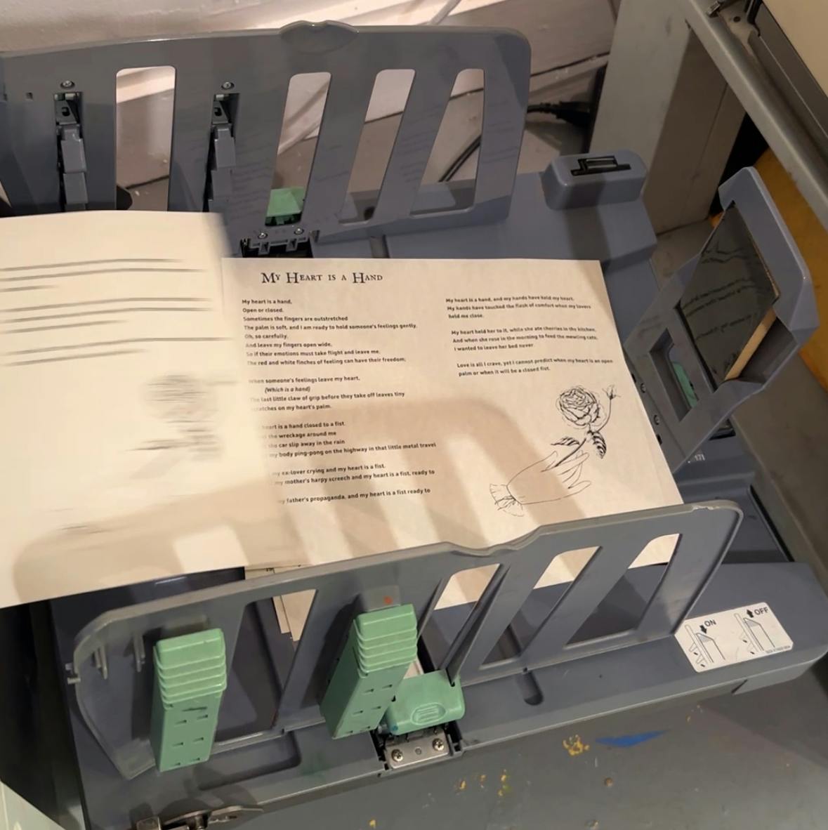 For many of you, you are here to get a copy of my handmade poetry book. Today I was able to learn on the Riso machine how to print double-sided pages in such a way that they make sense. So I have all of the pages prepared for the book itself and will be printing all of them this Thursday, May 16th. I'm very excited to show you more progress on this book on Thursday.