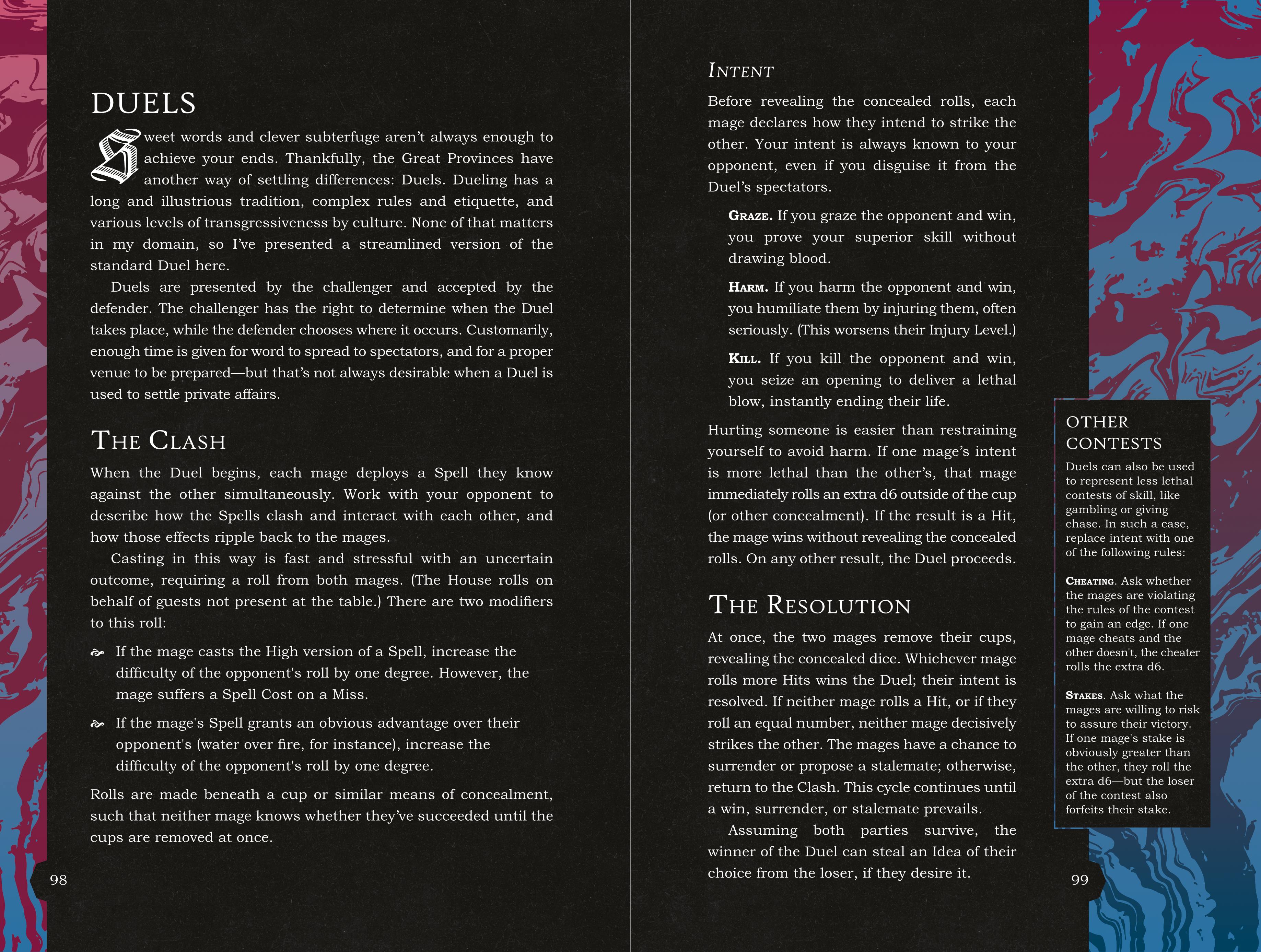 There are a few subsystems in the back half of the book for GMs to shake up slow seasons—Curses, Mysteries, Events, and so on—but my unequivocal favorite is Dueling.