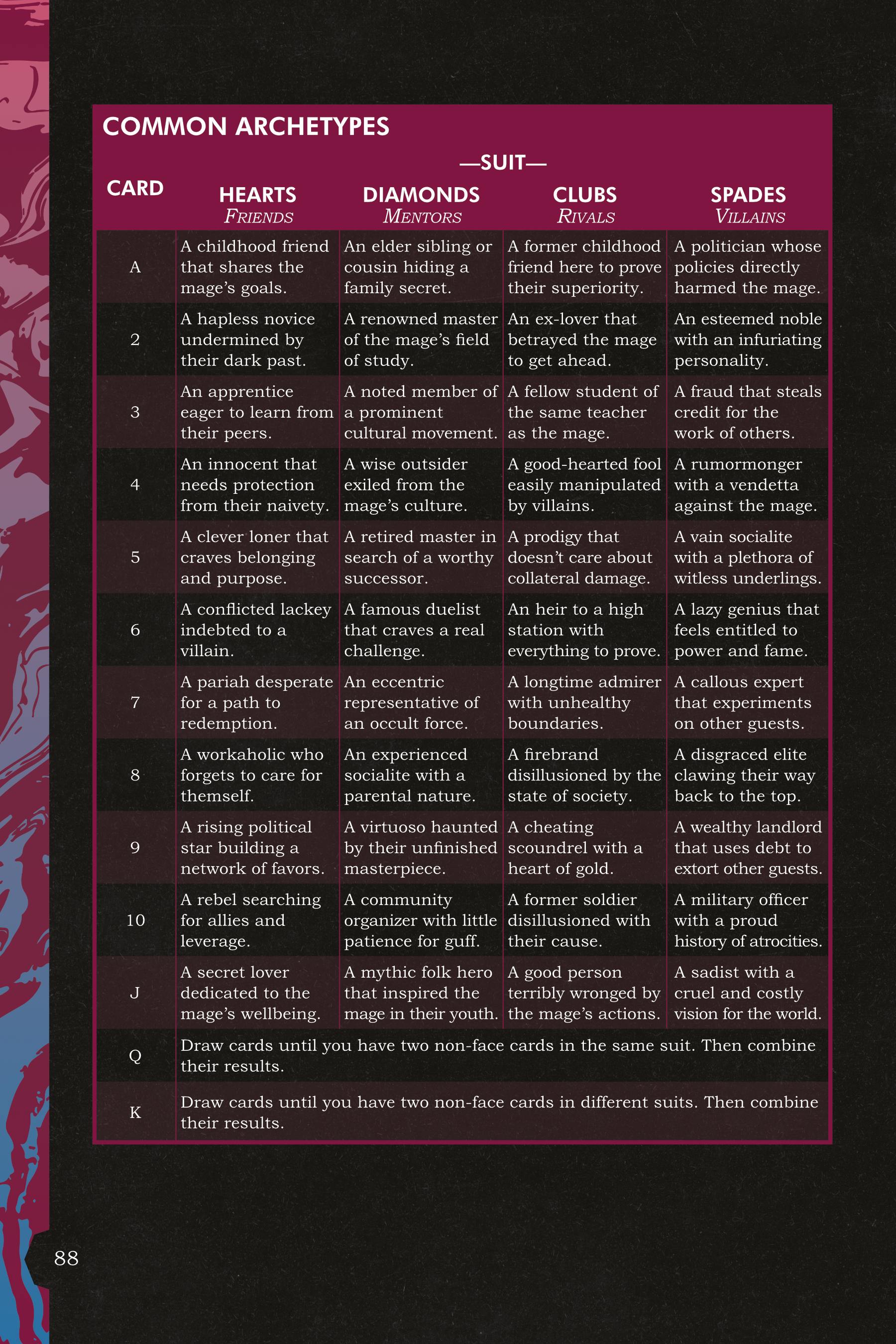 With a standard deck of playing cards—or, increasingly, a website that simulates a deck of cards—you can pick a mage, draw a card, and find that crucial first piece of a guest's shtick. Each entry poses either a prompt for the guest's behavior or a relationship to one of the mages—a solid starting point for you to build them out into a full NPC.