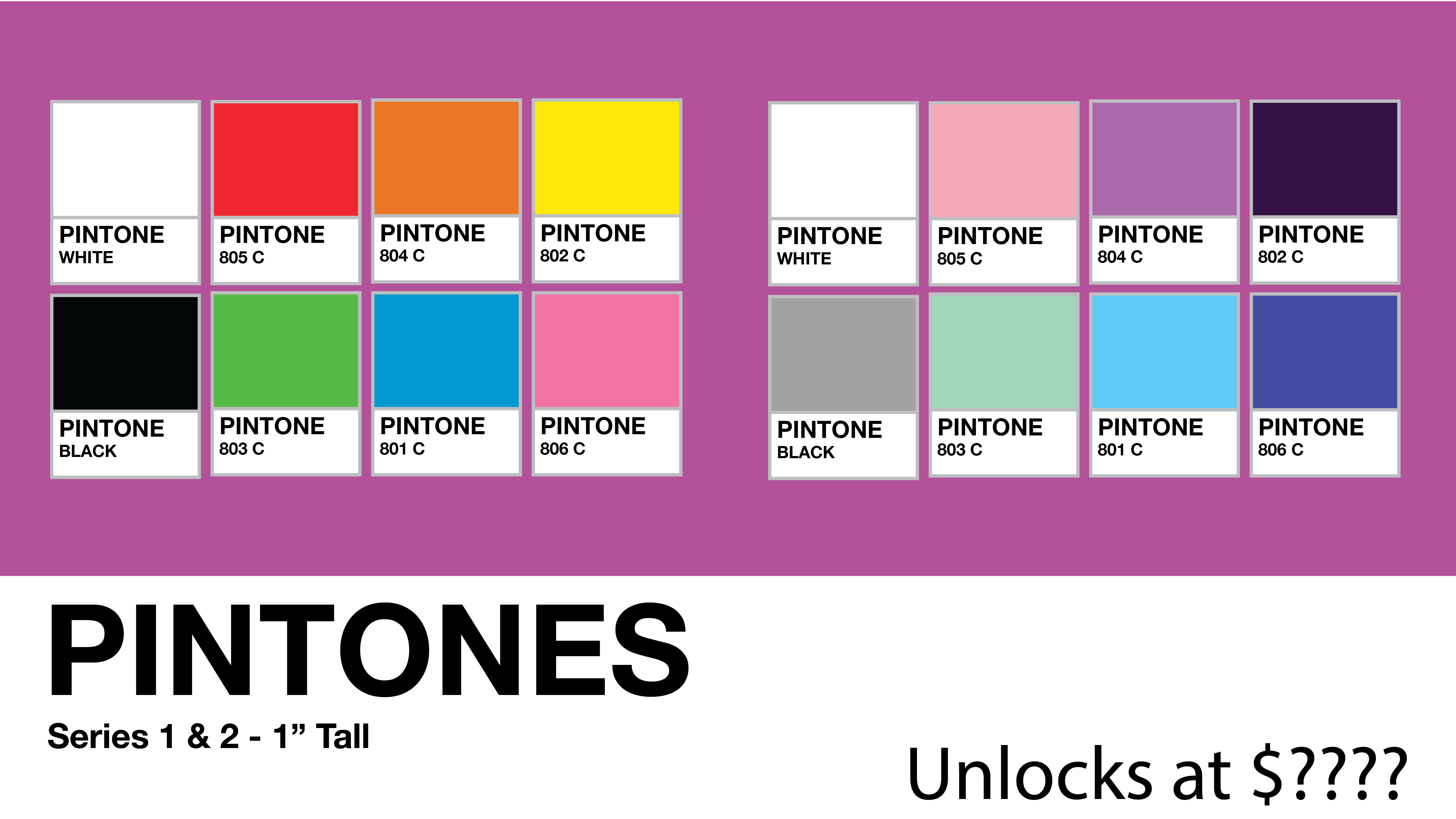 These would be solid pantones in rainbow/related colors unlocking in two sets of 8. (The pantone names and colors are incorrect here but a general idea of the range.