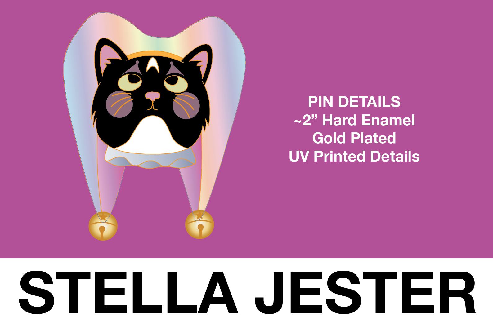 NOW since we've already passed the $2k mark - I've decided that Stella the Jester will become a pin! Artwork will change slightly to be pin-able, but I plan to use some UV printing for the gradient so it will generally remain unchanged!