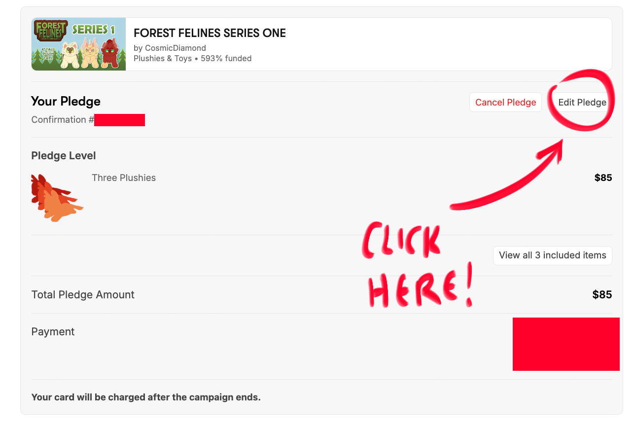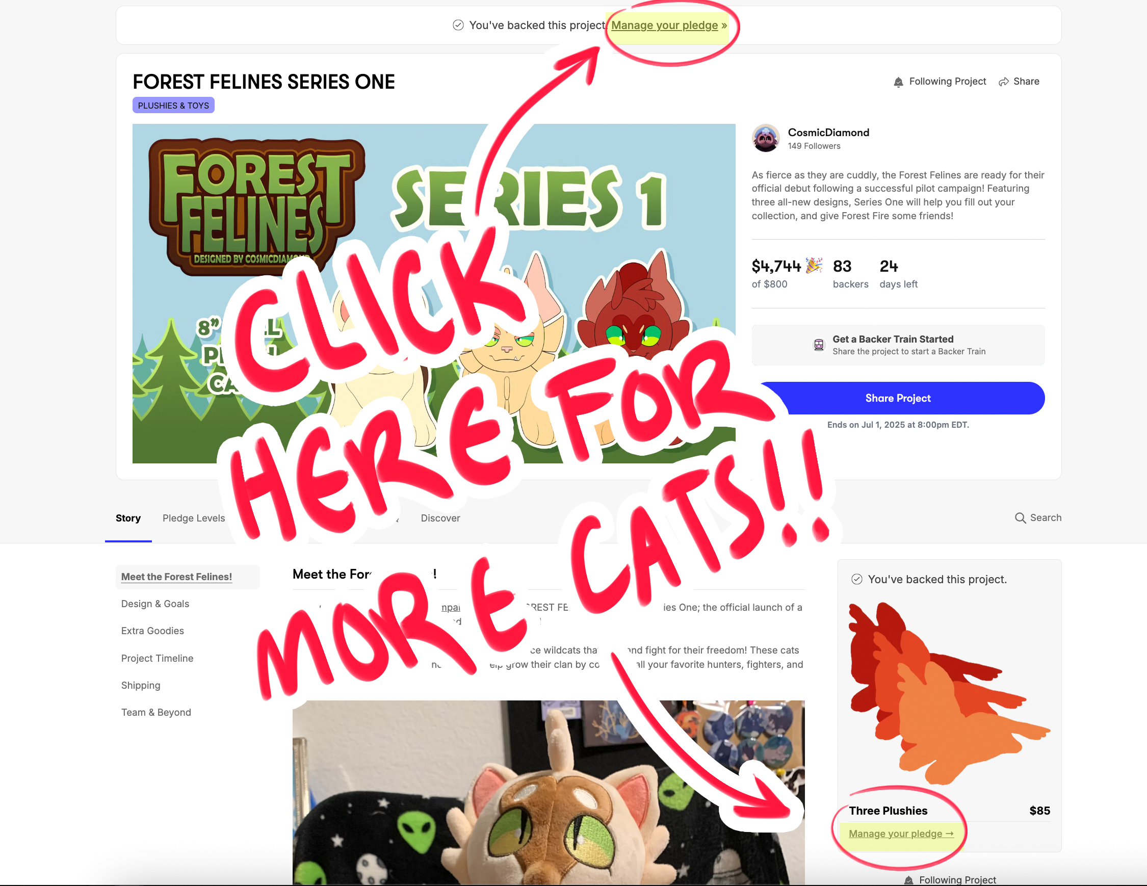 If you'd like to edit your pledge to add these new kitties OR one of the extra goodies, navigate to the campaign's homepage and select "manage pledge" and then you can select "edit pledge" to put add-ons to your order, change your pledge level, and more!