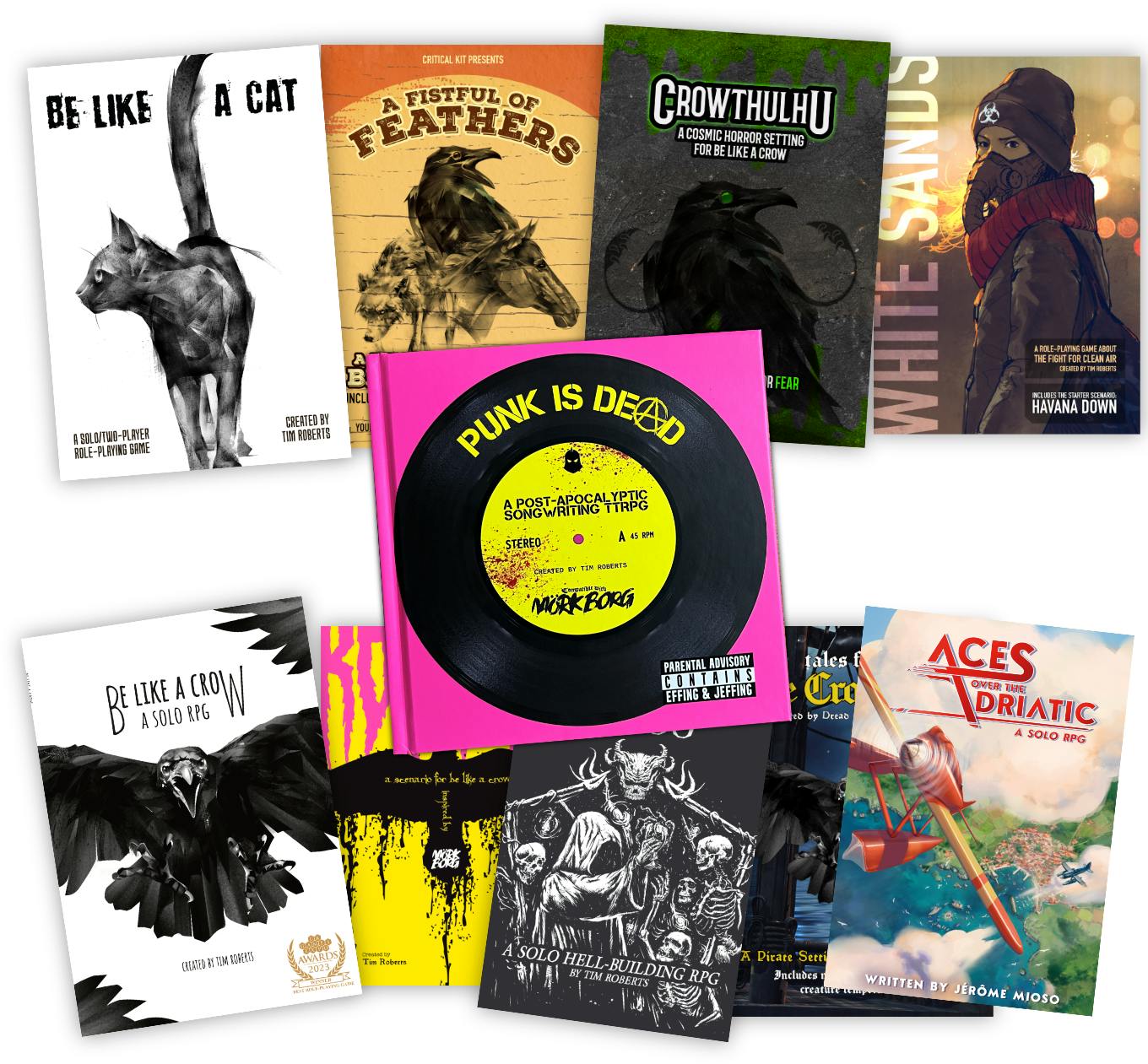 Tim Roberts is an award-winning creator of solo role-playing games including Be Like a Crow, Be Like a Cat and d666. Originally from Bradford, West Yorkshire, he now lives in Somerset where he runs an independent TTRPG publishing company. When he's not writing, he's thinking of things to write.
