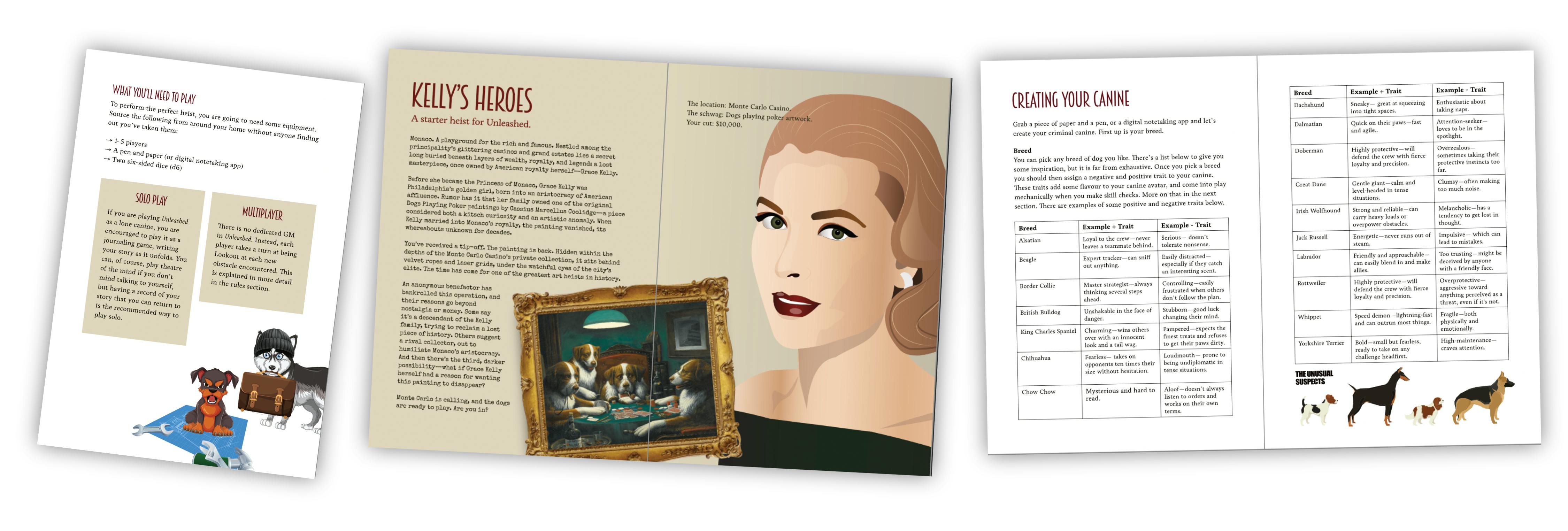 Ready to commit the paw-fect crime. In this TTRPG for one or more players, you will take on the role of canine criminals robbing from the rich to feed the strays.