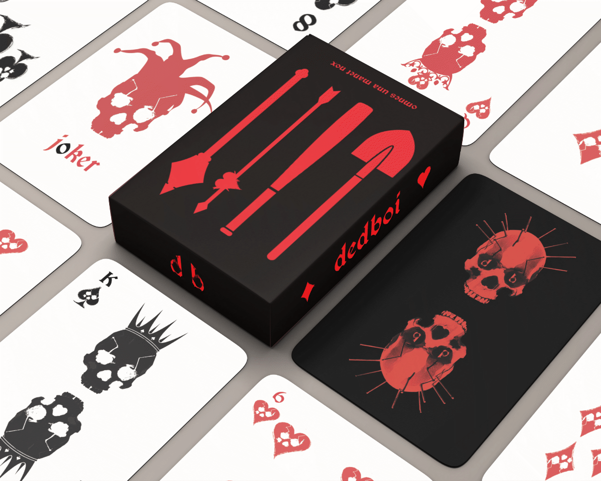 In the meantime, here is a mockup of the Tuckbox for the cards. The reverse has the DedBoi skull as featured on the Ace of Diamonds from the deck.