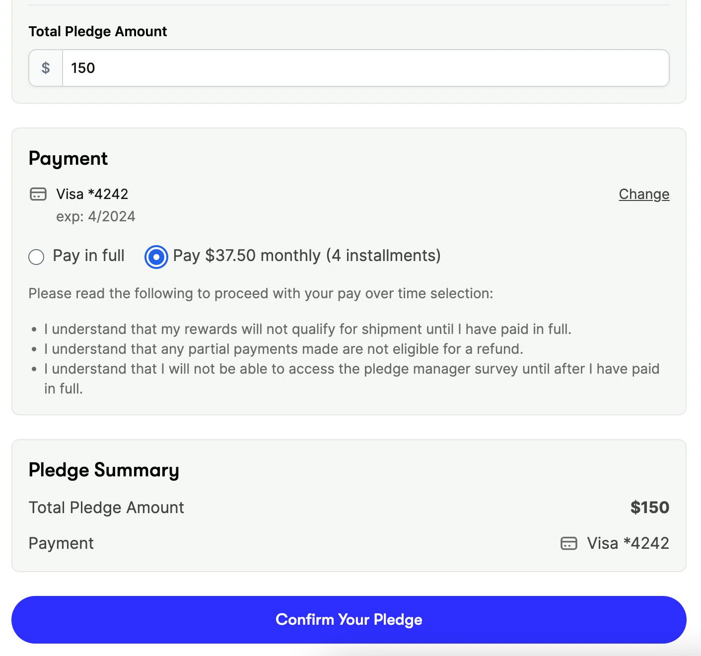 If you’ve wanted to increase your pledge above $150 but could’t do so, now you can choose to pay over time! To set it up, simply manage your pledge and go through checkout again. If the option is available for your pledge, here’s what your checkout should look like: