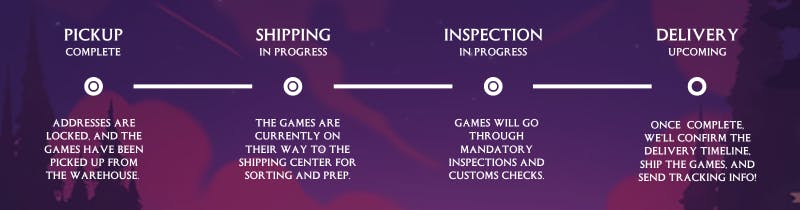 We know many of you have been eagerly waiting for an update, and we want to share everything we know so far. Right now, we’re deep in the shipping phase - things are moving, but there’s still a bit of a waiting game while your games make their way through customs and into warehouses.