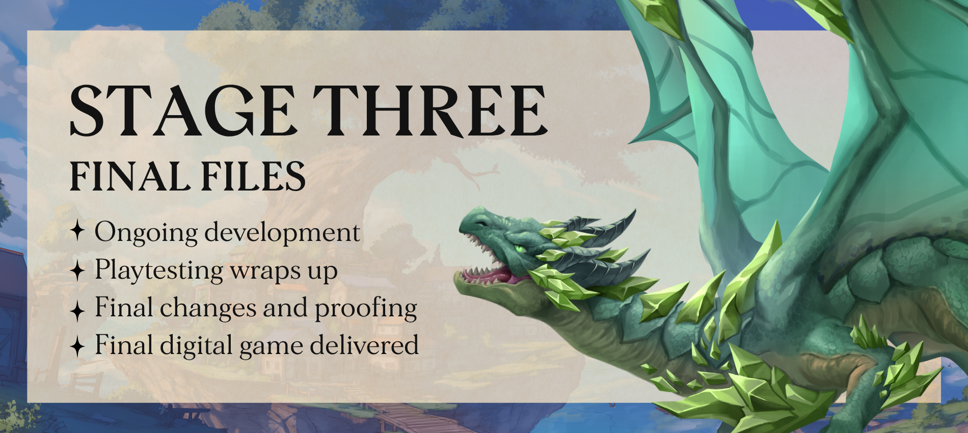 This stage is where the final edits happen, like including layout, proofreading, and export troubleshooting. Once playtesting wraps and revisions are complete, we’ll deliver the finished digital game to all eligible backers!