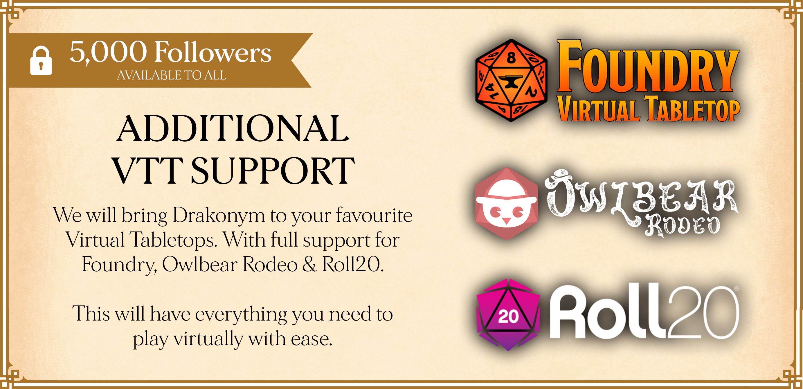 You told us where you love to play - so we’re bringing Drakonym to you! At 5,000 followers, we’ll unlock native support for Foundry, Owlbear Rodeo, and Roll20. You’ll be able to play Drakonym your way, on the platform you love most!