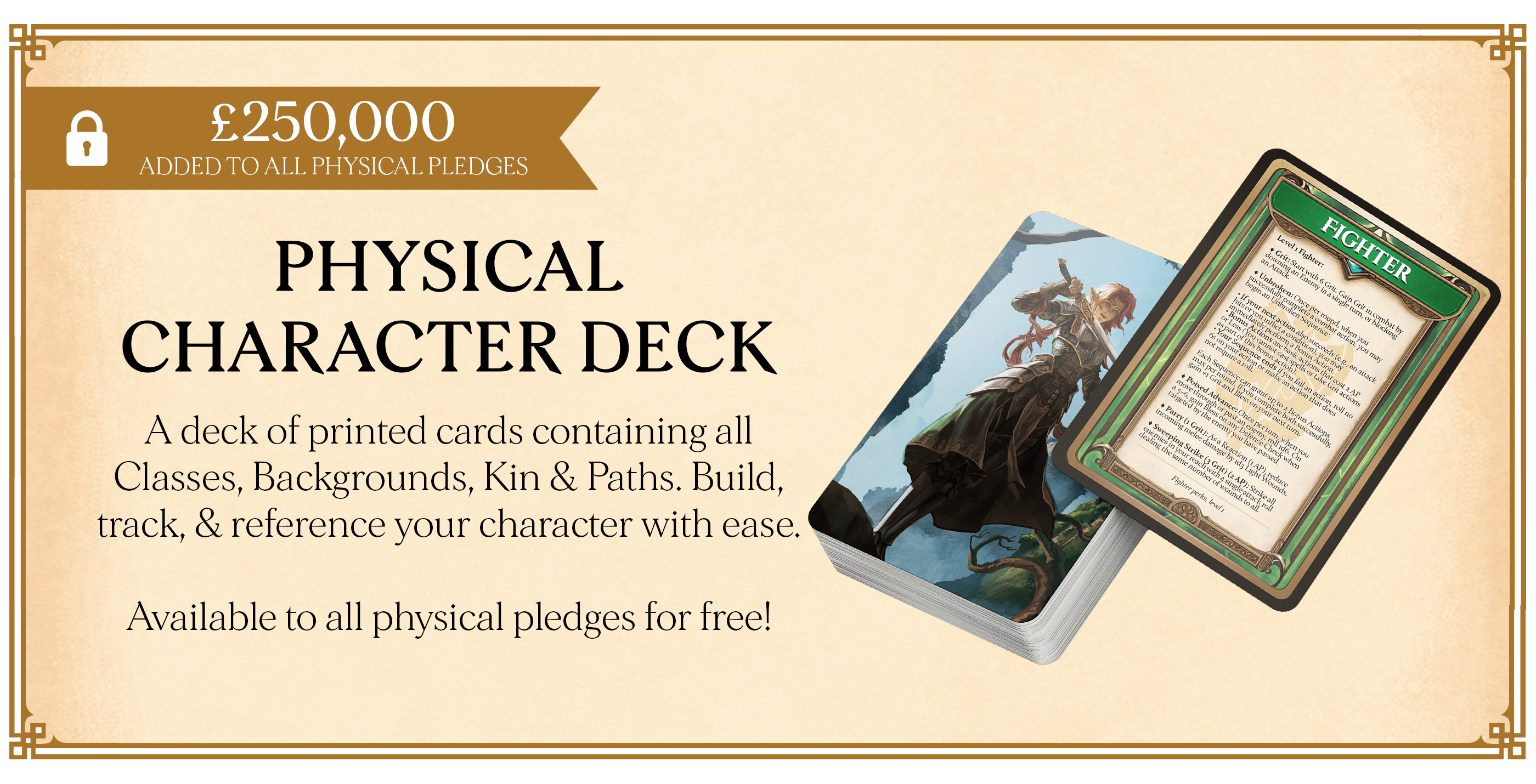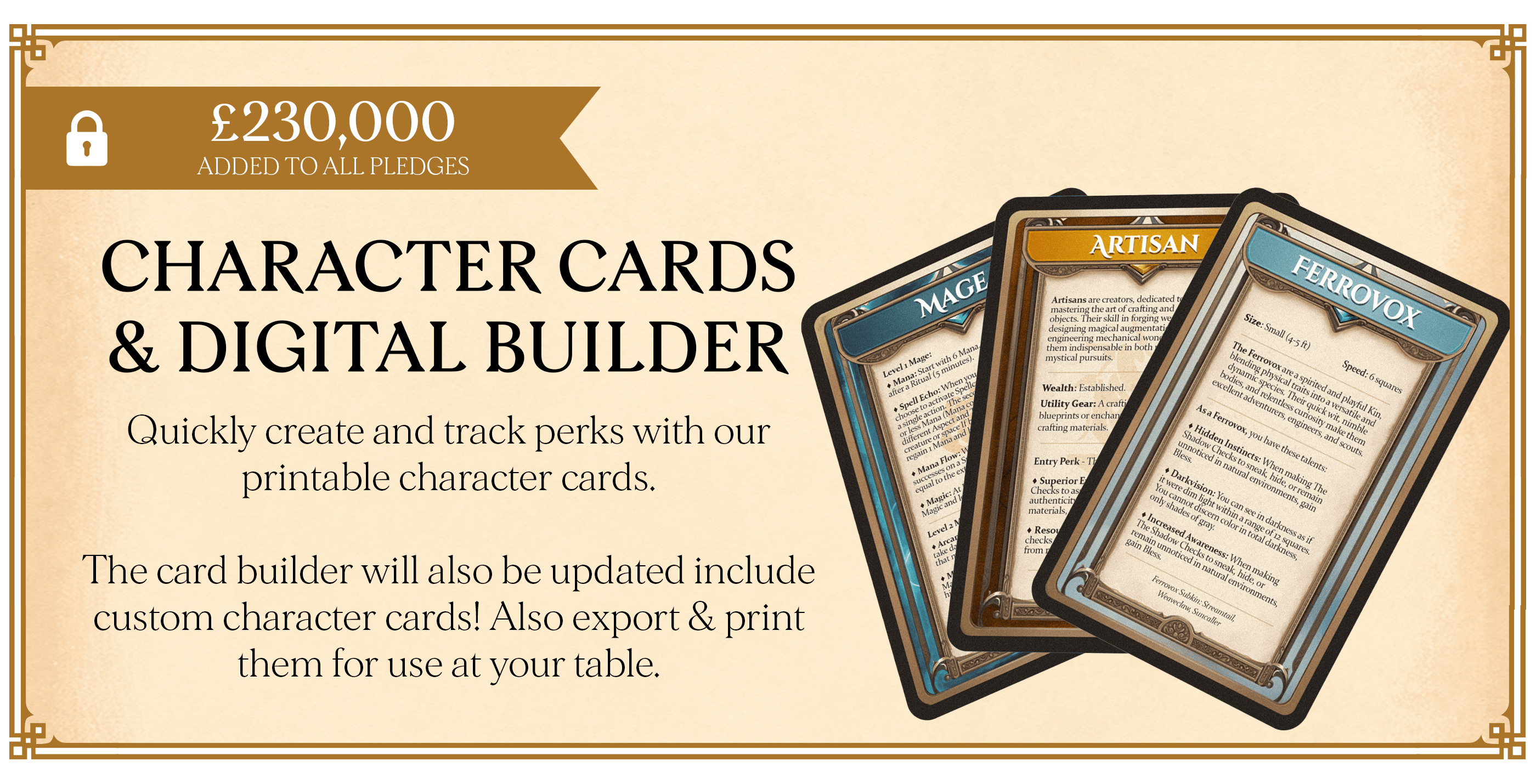£230k - Printable Character Cards (all pledges): create and track perks with cards you can print at home or use in our upgraded Digital Builder. £250k - Physical Character Deck (physical pledges): a full printed deck of classes, backgrounds, kin, and paths.