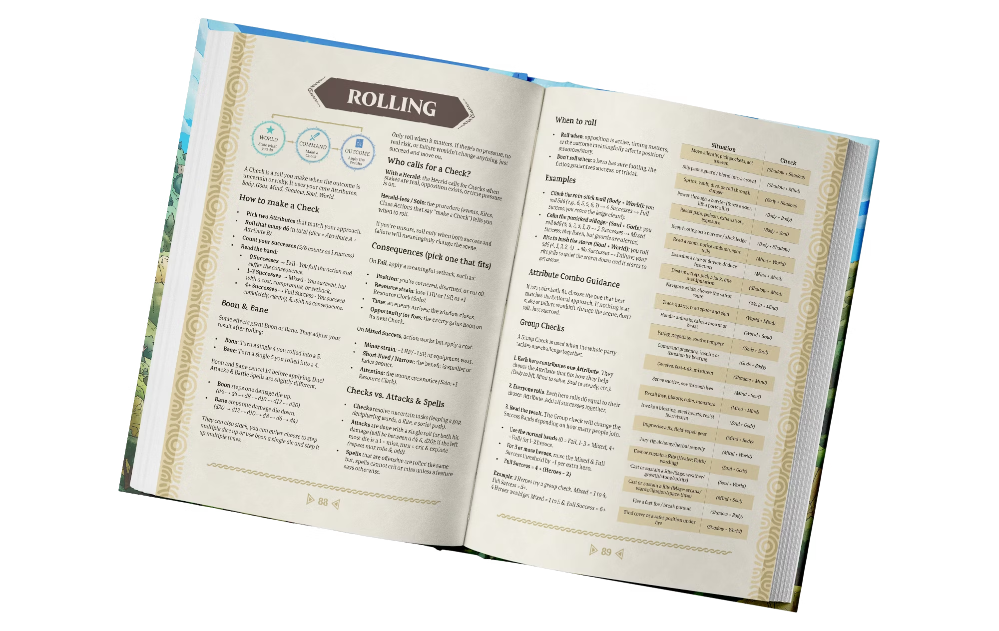 A fast, intuitive dice system using small dice pools and clear success thresholds.