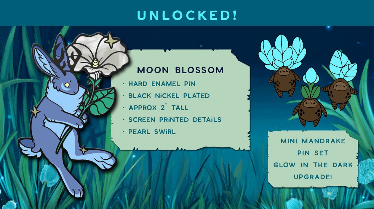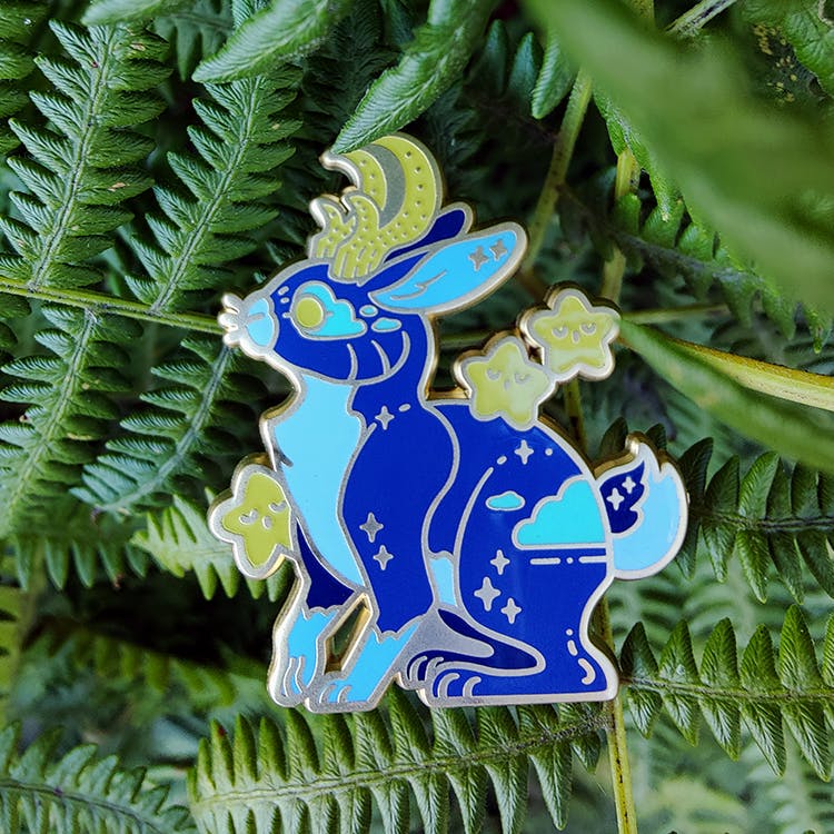 I will be adding limited extra inventory that will be available to be added onto pledges in the surveys including guest artist items from my previous Lunar Jackalope campaigns with enamel pins by Wisparia and JasmineTwil, and an acrylic charm by JmePaints!