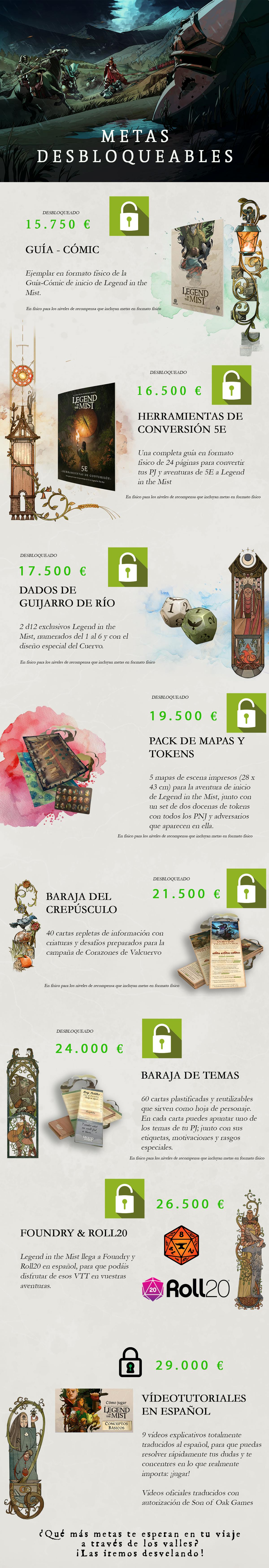 En este Backerkit queremos lanzar los dos manuales básicos (Vol. I - El héroe y Vol. II - El narrador), junto con el manual de ambientación Corazones de Valcuervo y una serie de complementos para el juego (pantalla del narrador, personajes pregenerados, barajas, dados, etc.).