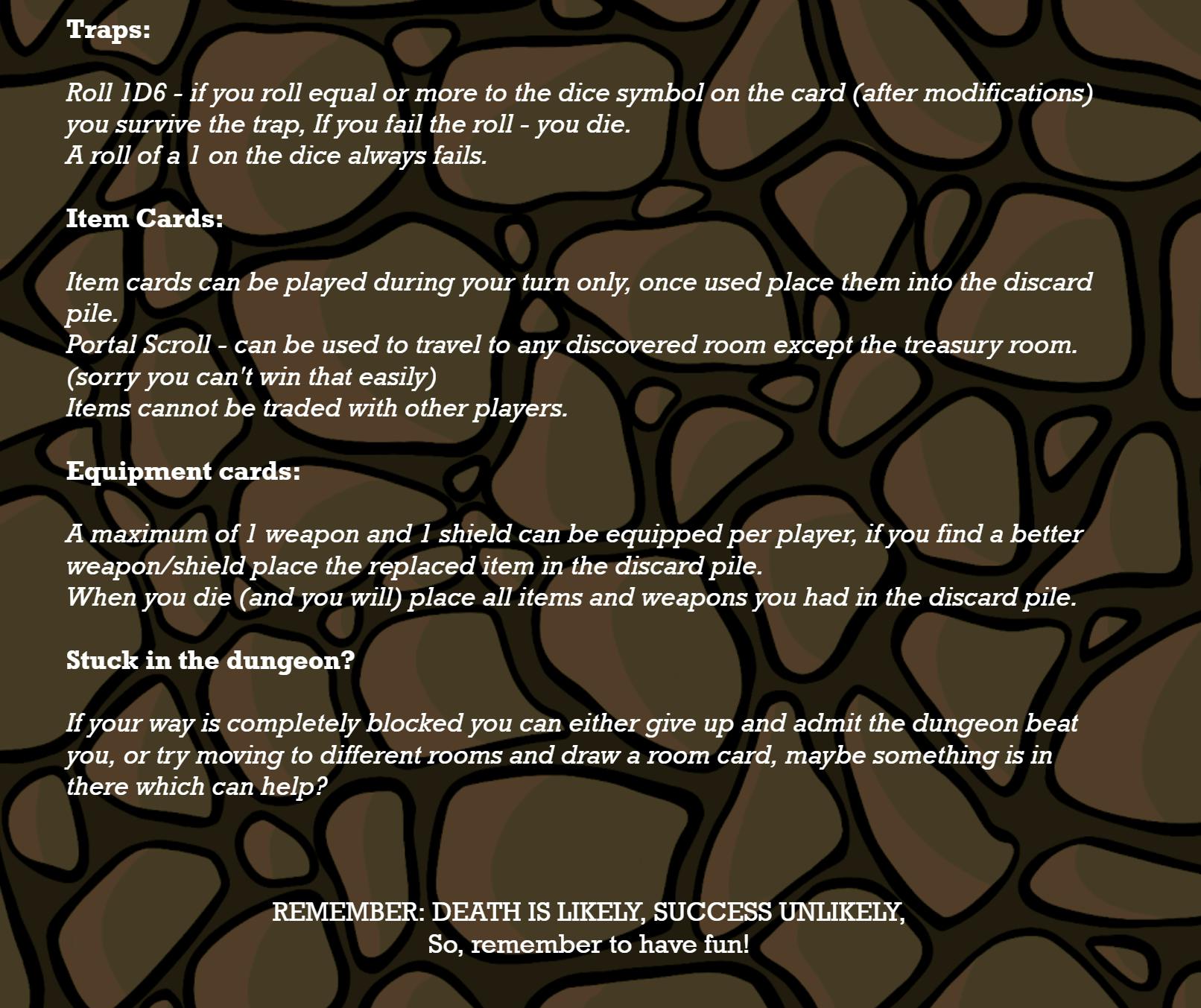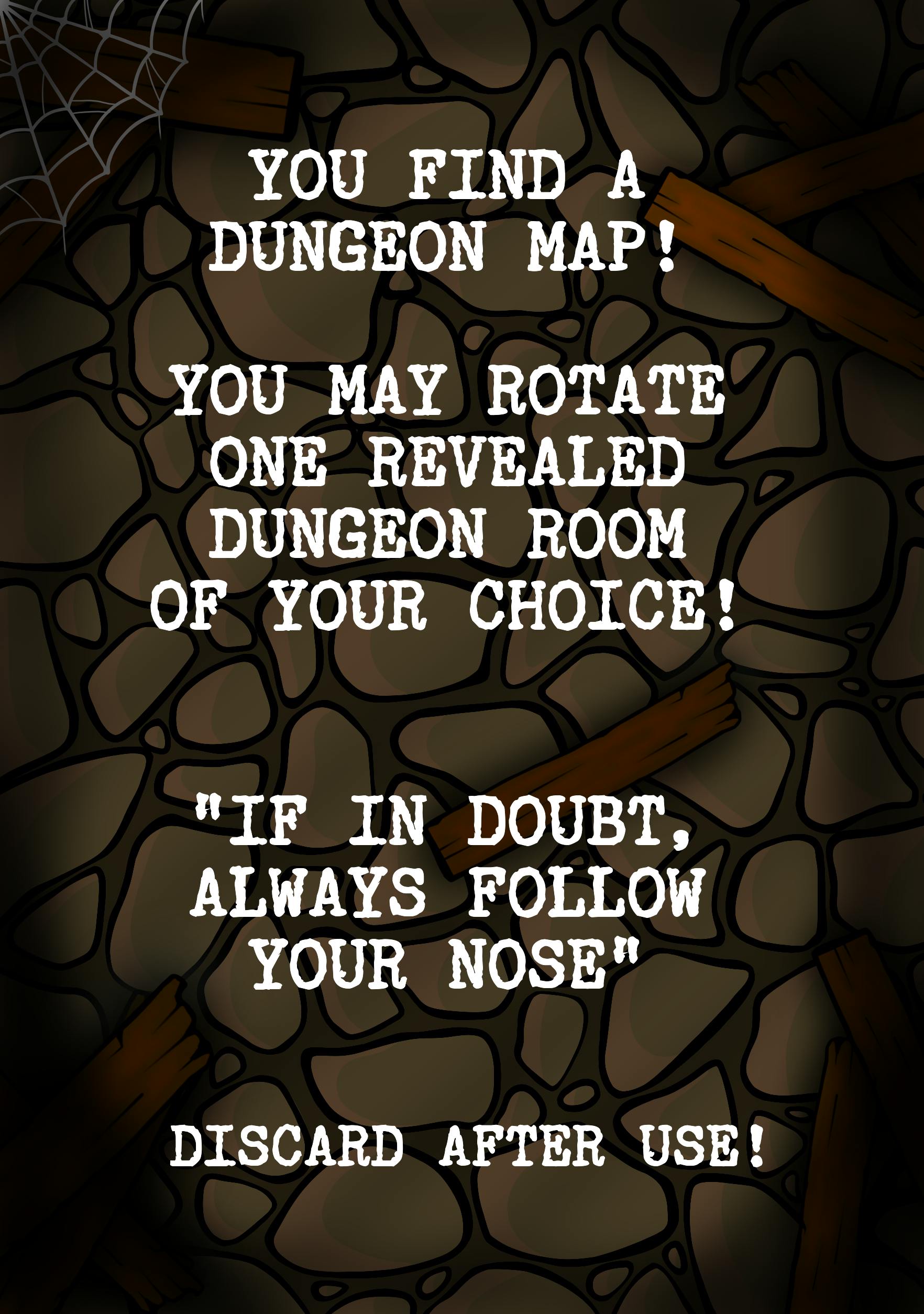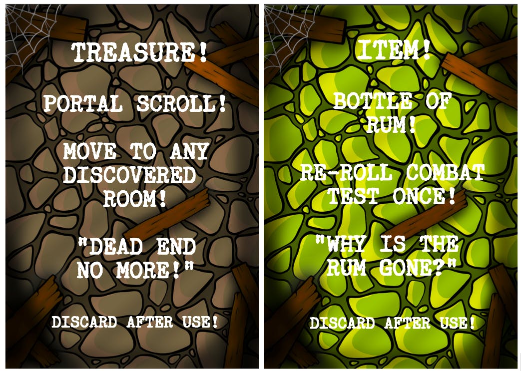 Room and Treasure Cards - Currently creating more individual cards so there are less duplicates. This allows for more variety every game, by adding more references, jokes, innuendos to card text on both dungeon room cards and treasure cards.