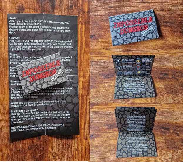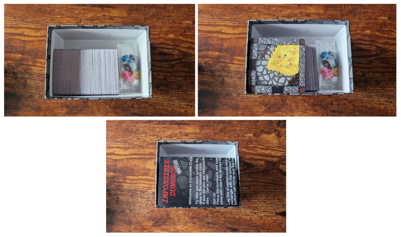 Impossible dungeon will contain over 50 Tile cards, 200 room and treasure cards, rule book, dice and 6 meeples all in a box small enough to fit in your hoodie pocket.