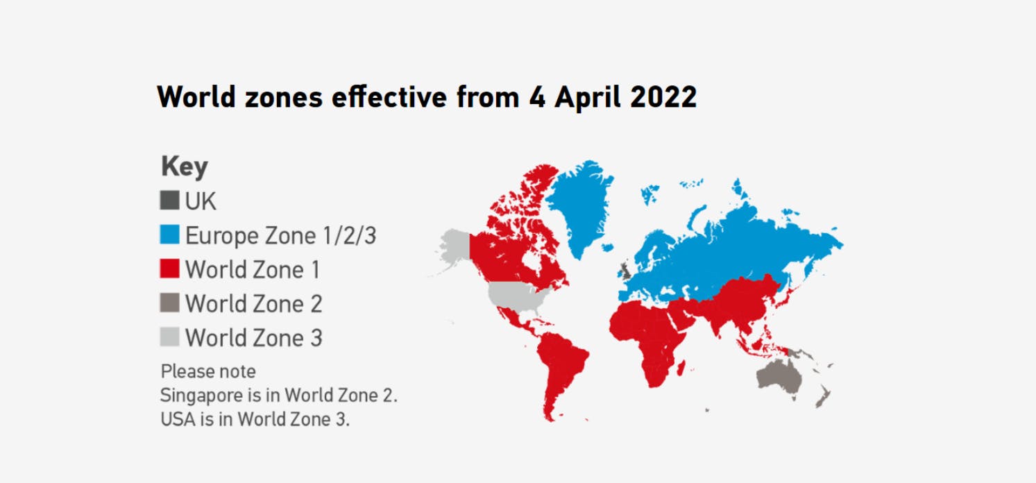 UK - Approx Β£6 Europe Zone 1 - Approx Β£10 Europe Zone 2 - Approx Β£10 Europe Zone 3 - Approx Β£11 World Zone 1 - Approx Β£17 World Zone 2 - Approx Β£18 World Zone 3 - Approx Β£17