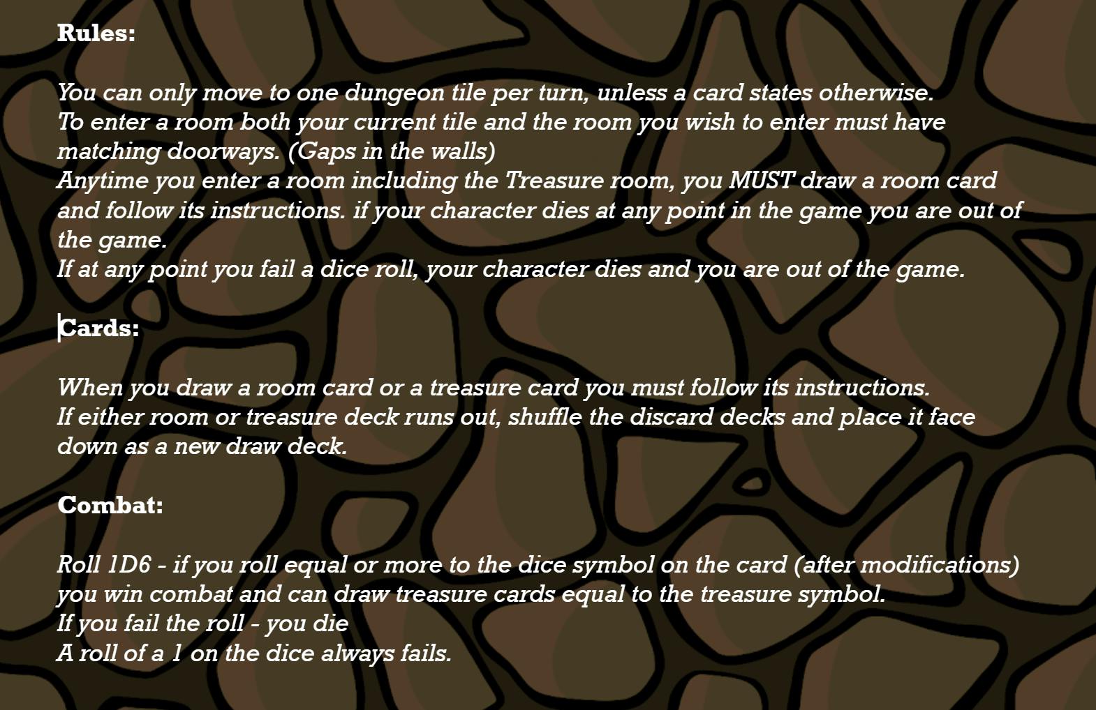(Side note in regards to the room and treasure cards, i would like most of these cards to be individual so no game is ever truly the same, so if you back this project, any ideas for cards are more than welcome.π)