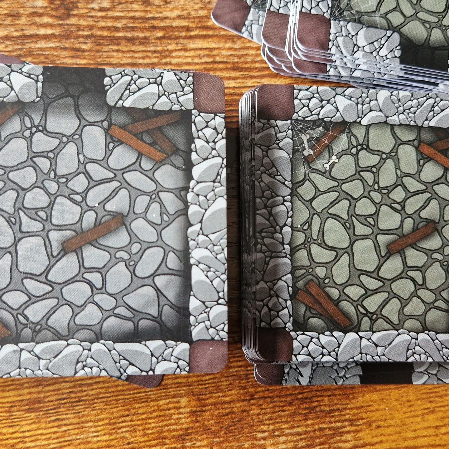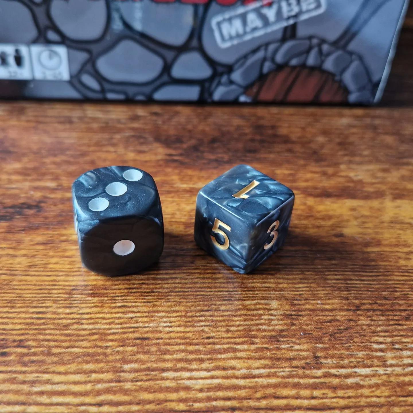 The new dice design has gone from a black or white dice with pips to a nice new grey marble effect with numbers to match the symbols on the Dungeon Room Cards.