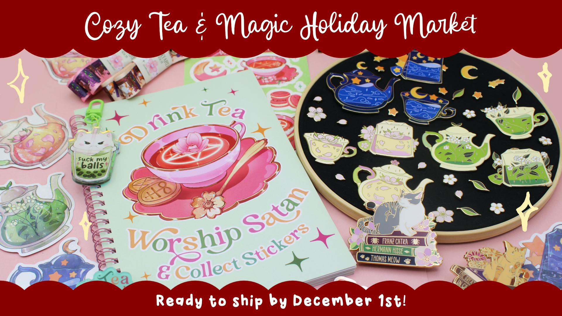 - Sticker Book with blank silicone paper: Drink Tea, Worship Satan & Collect Stickers (value 18€ -> 12.6€) - 1x Drink Tea Worship Satan Holo Sticker (value 3€ -> 2.1€) - 9x Magic Tea Party Stickers (value 23€ -> 16.1€) - 1x Occult Tea Party Sticker (value 6€ -> 4.2€) Value 50€ -> 35€ (30% off)