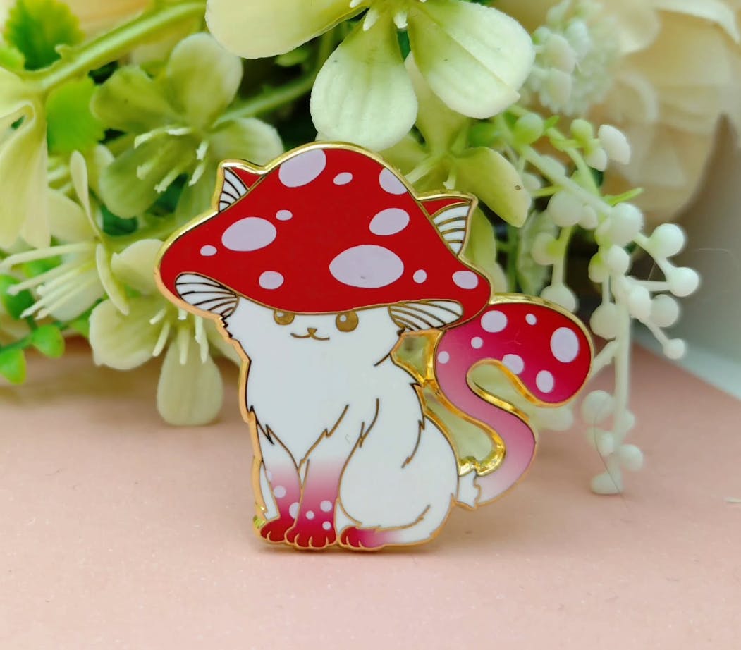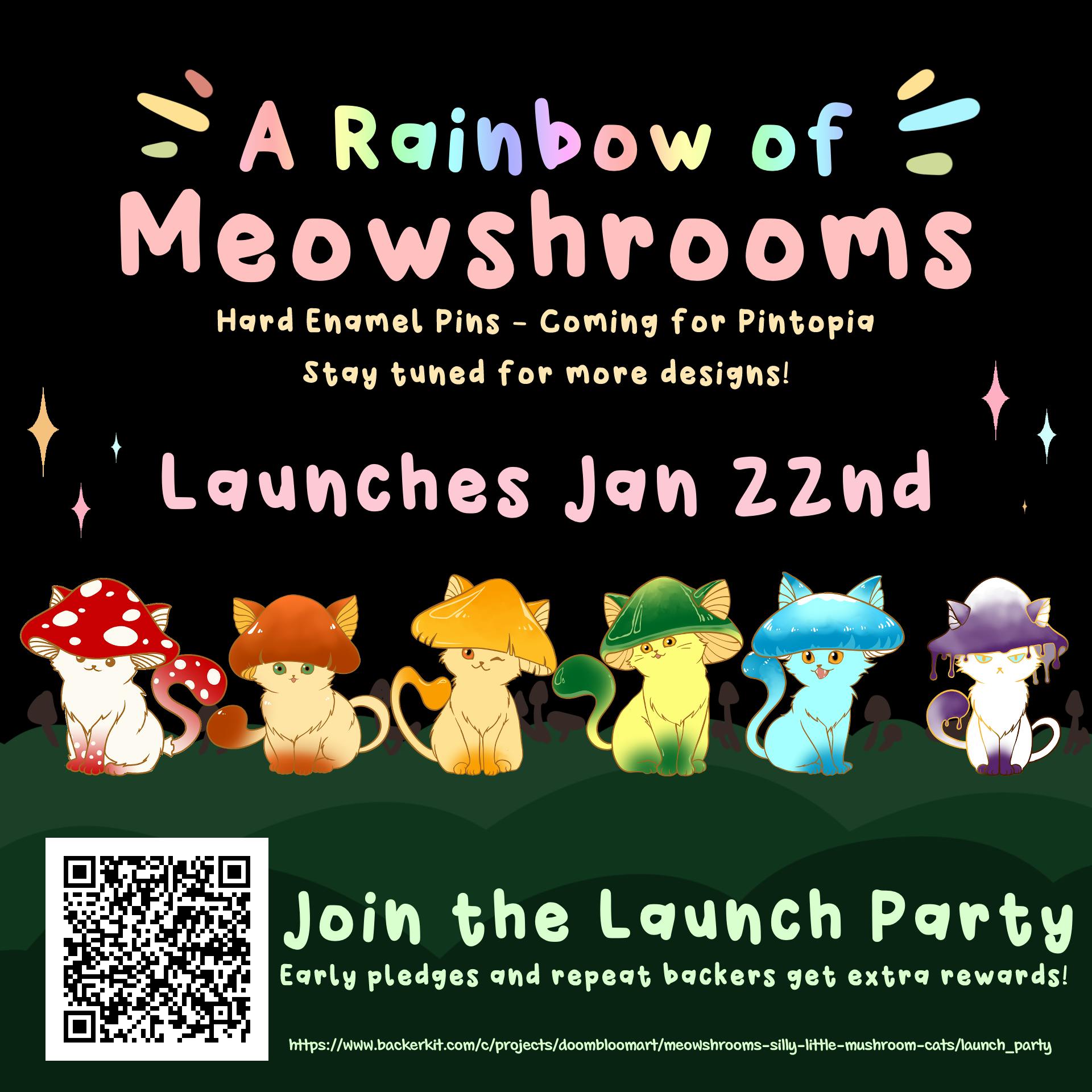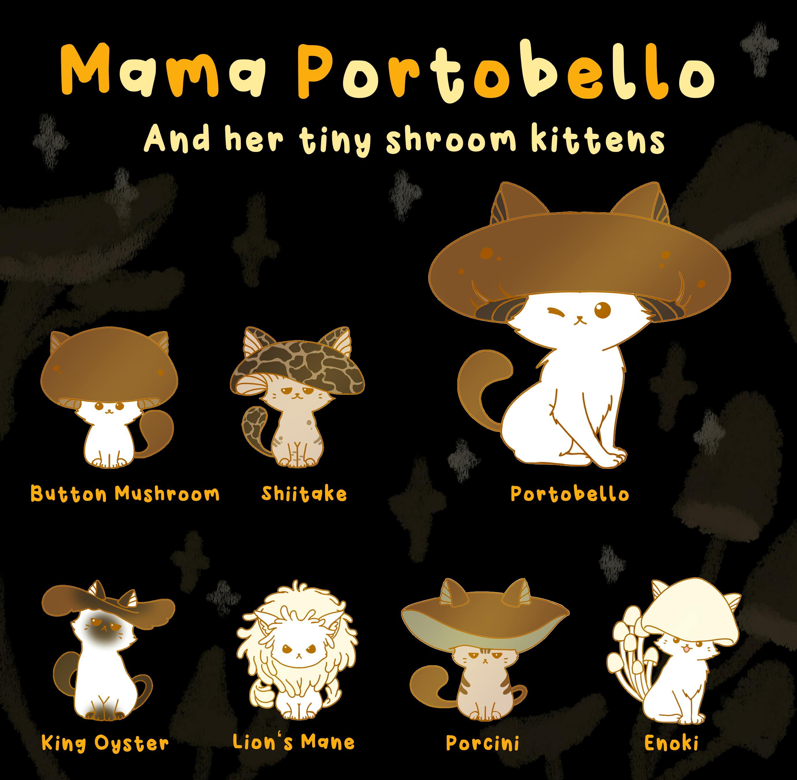 Welcome to Meowshrooms! We are launching as a part of Pintopia 2026 and I am here to make sure everyone‘s year starts with something silly and cute! Creatures that are half mushroom half cat, in two subcollections: one is colors of the rainbow and the other collection is culinary mushrooms with a big portobello mom cat and tiny little baby meowshrooms!
