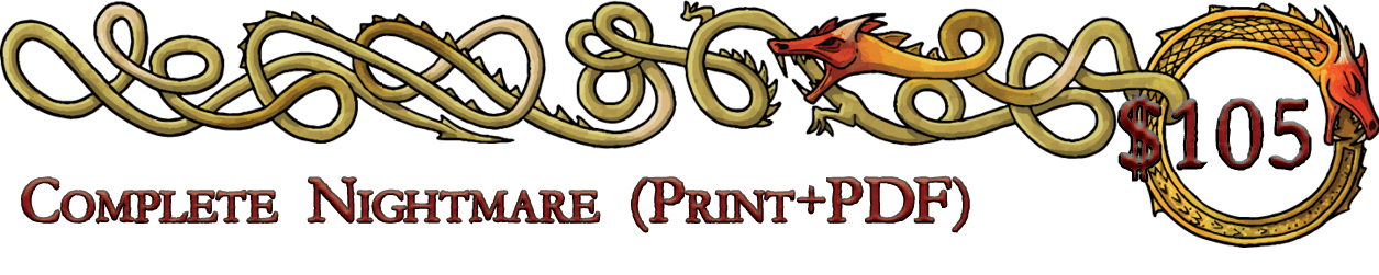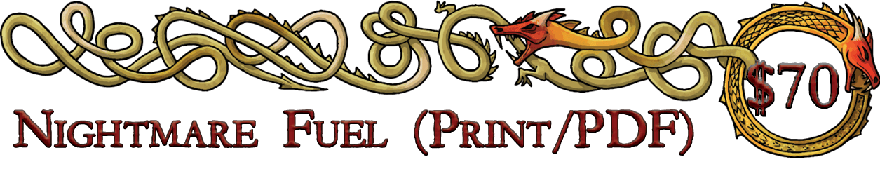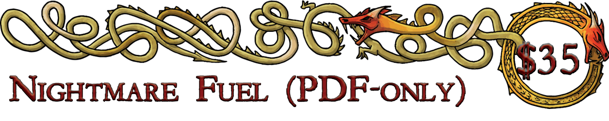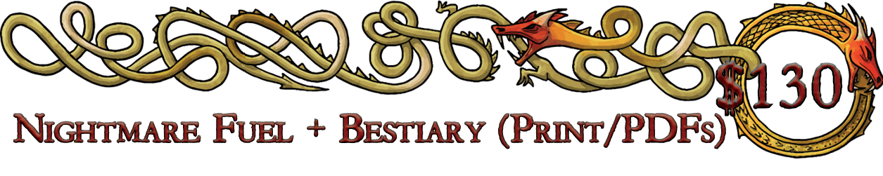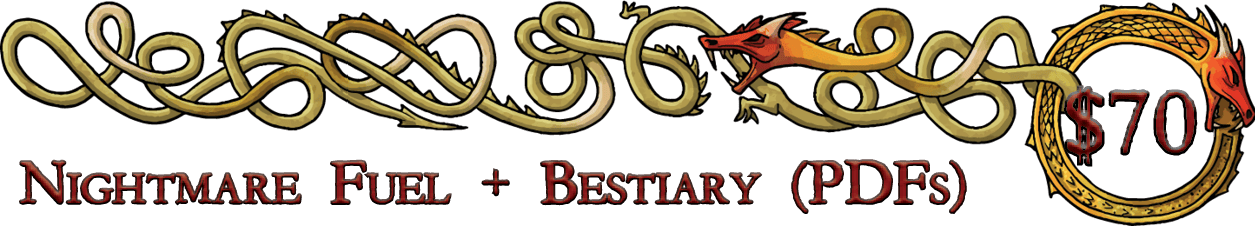 Nightmare Fuel provides three themed books of monsters: Serpents of Legend (40 pages), The Bugstiary (36 pages), and Garden of Evil (20 pages).
