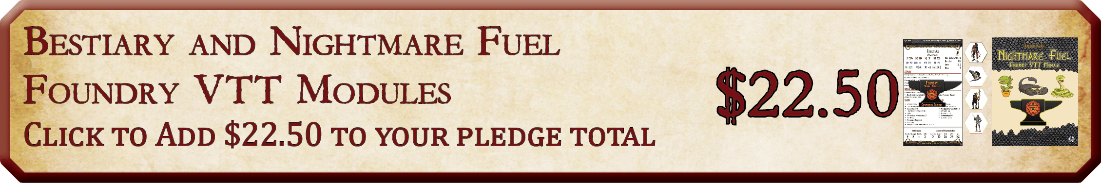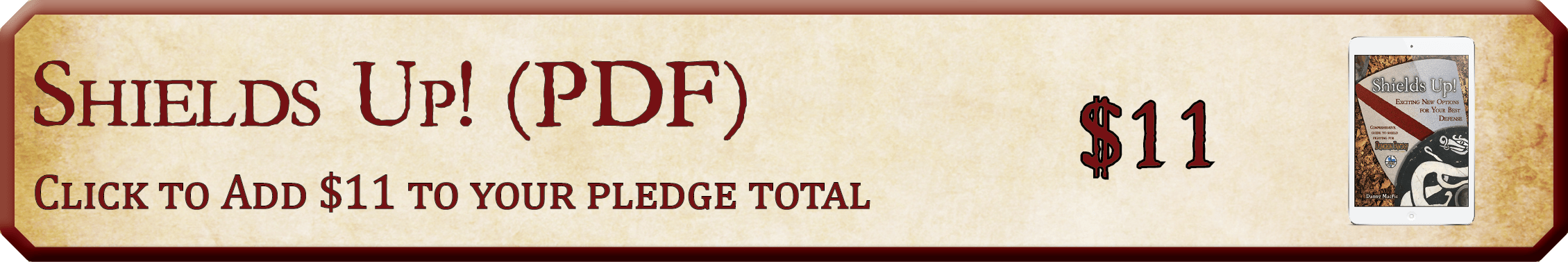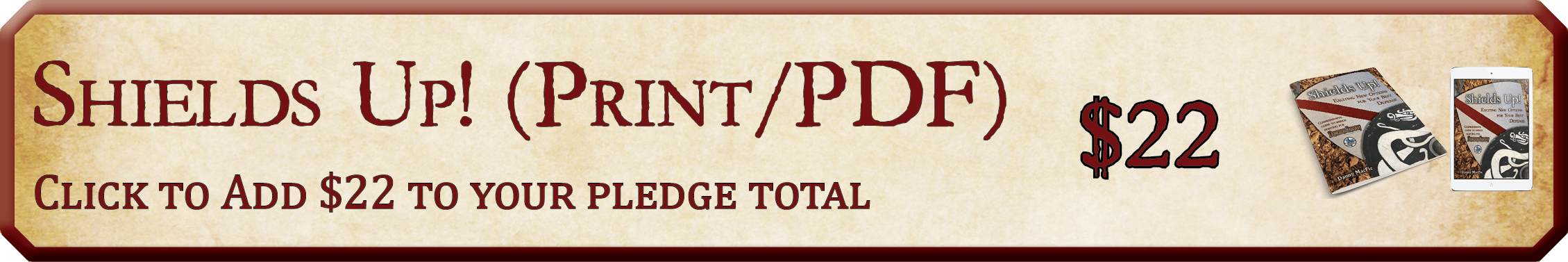 This pledge level gets you all the Nightmare Fuel products, including the PDFs of the Quick-Reference cards and the VTT, in digital format. It also includes the new book Shields Up! which does for shield use what Fantastic Dungeon Grappling did for wrestling. Assuming that appeals to you!