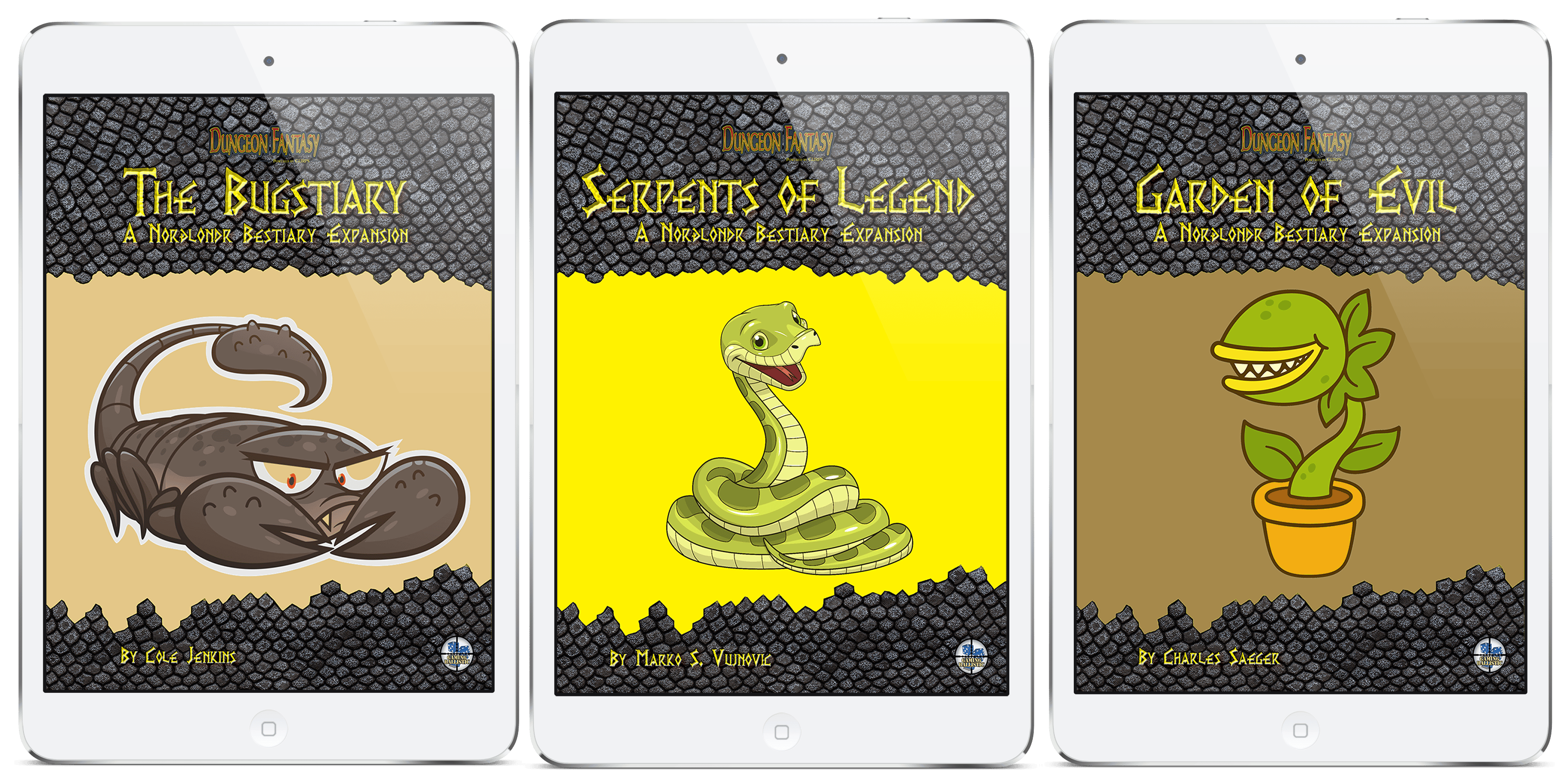 Three new bestiary volumes for the Dungeon Fantasy RPG! Terrible slithering things, creepy-crawlies with their skeleton on the outside, or no skeleton at all, and a selection of awful green things. Three books filled with Nightmare Fuel!