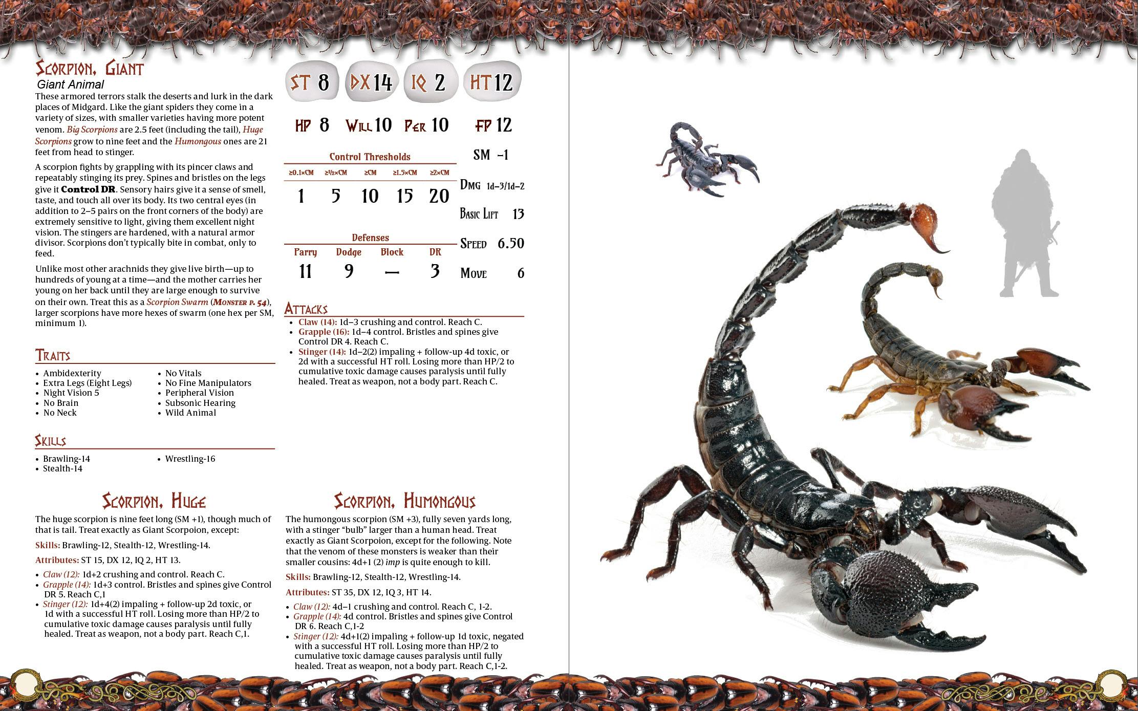 Really, what could be better for the Dungeon Fantasy RPG than a bunch of creatures with their skeletons on the outside? Or perhaps no skeletons at all? Armored monsters with pinching claws and stinging tails? Oh, yes. Count me in.