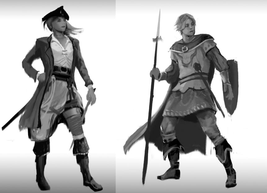 Two of our three heroes, Moray and Lance, in a medium Work in Progress state, by Piotr Jamroz.