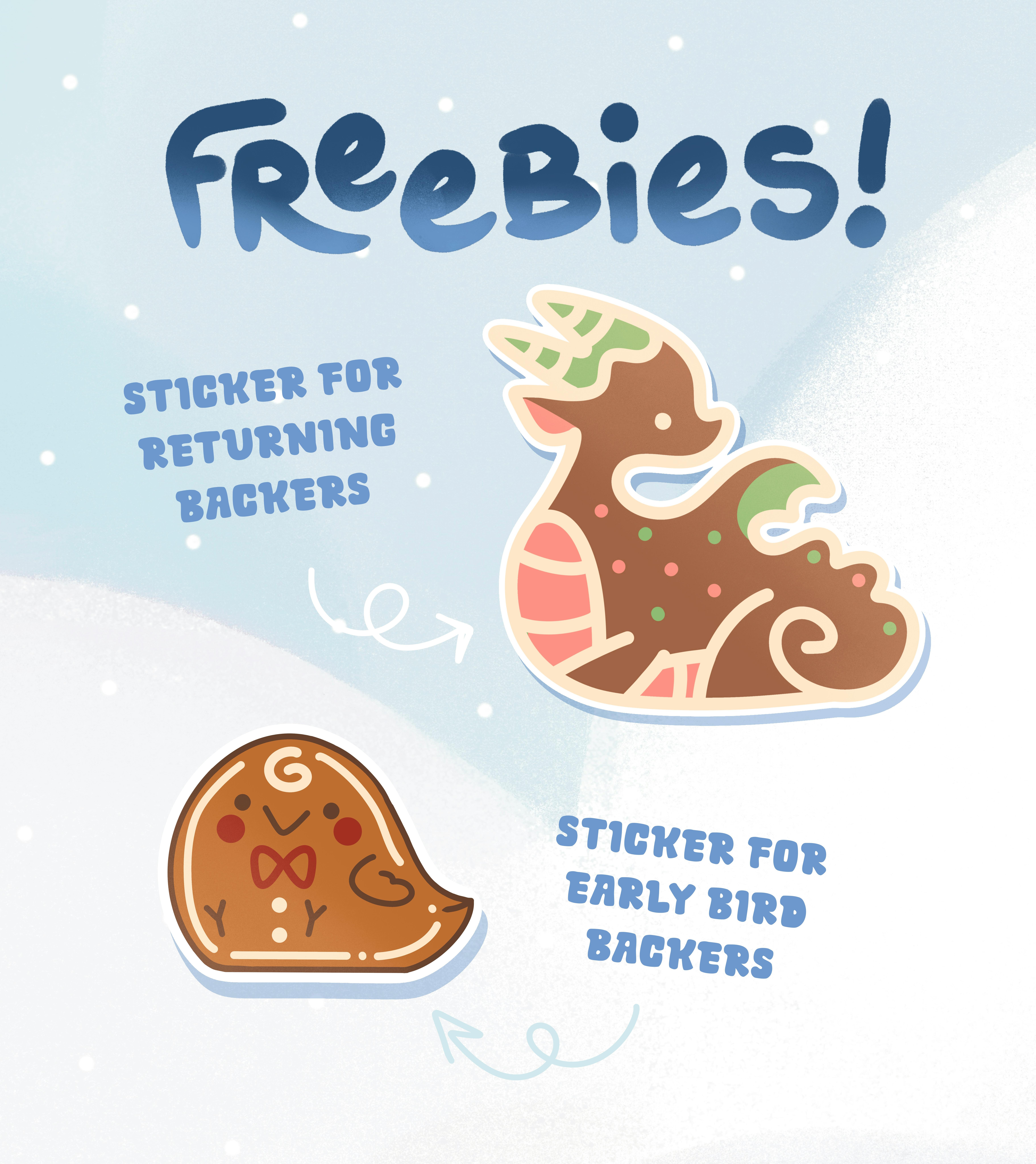 We also have Returning Backer and Early Bird incentives in the form of Gingerbread stickers! Early bird backers will have a gingerbread chick sticker and returning backers will have a gingerbread dragon sticker!