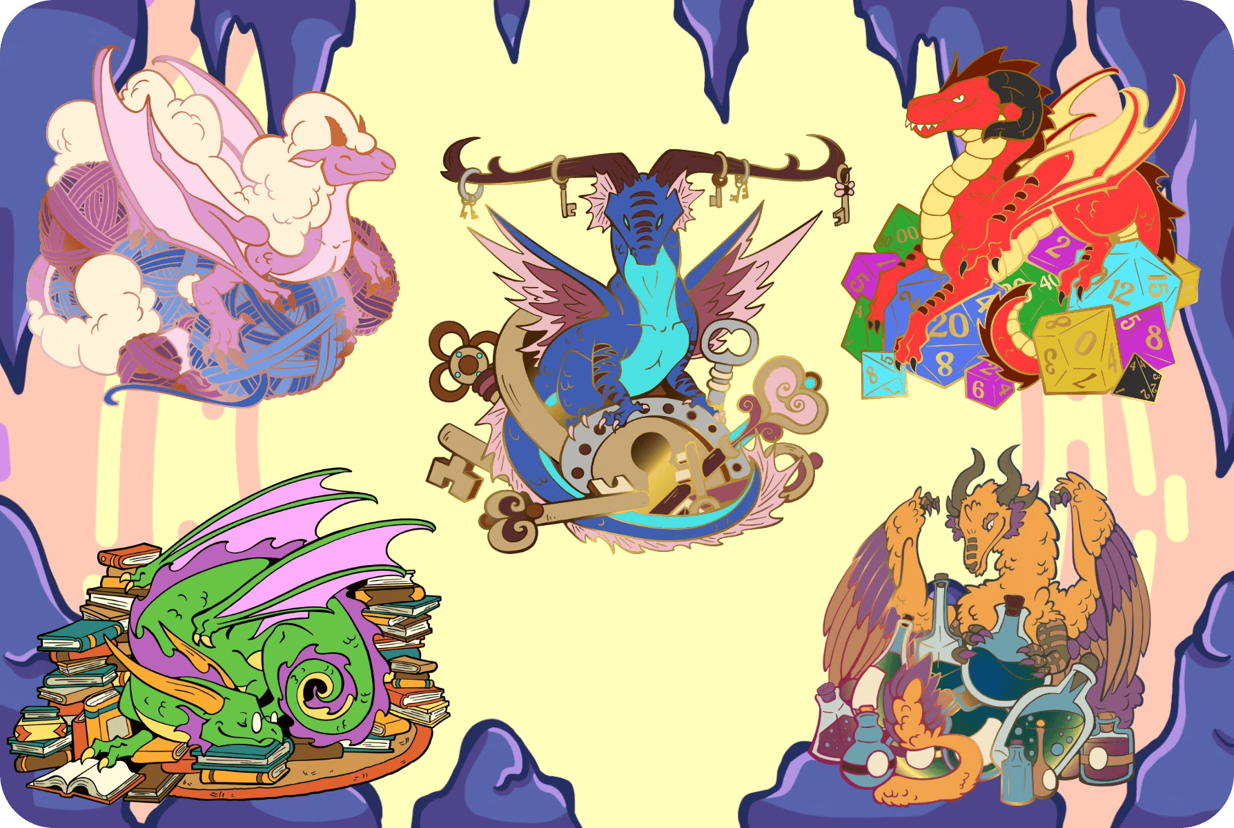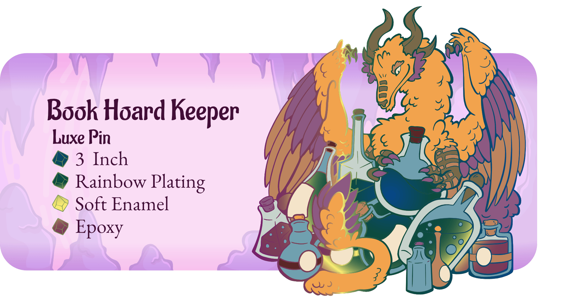 These magnificent enamel pins depict dragons curled proudly around their favorite things in the whole world. These Hoard Keepers are big, shiny, and utterly obsessed.
