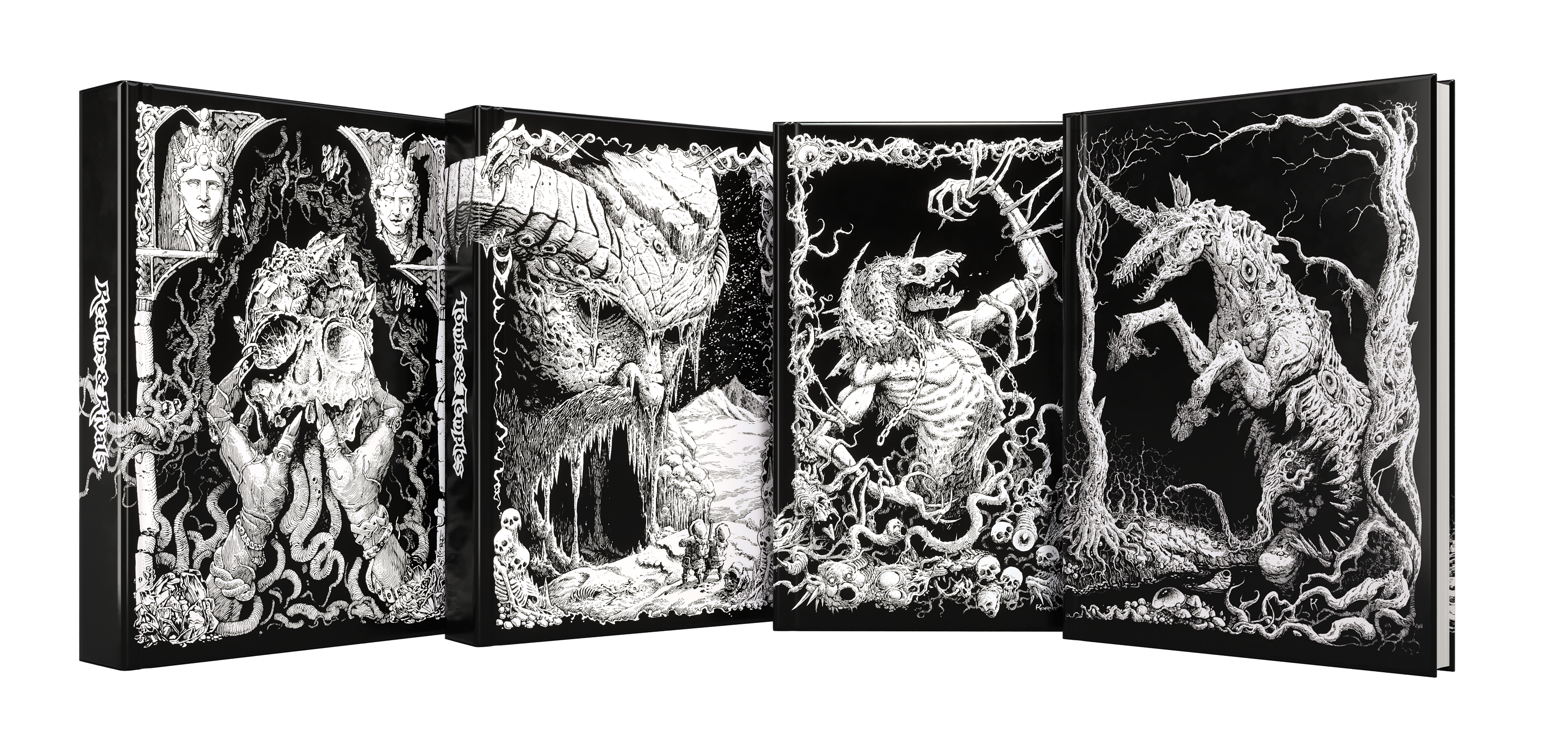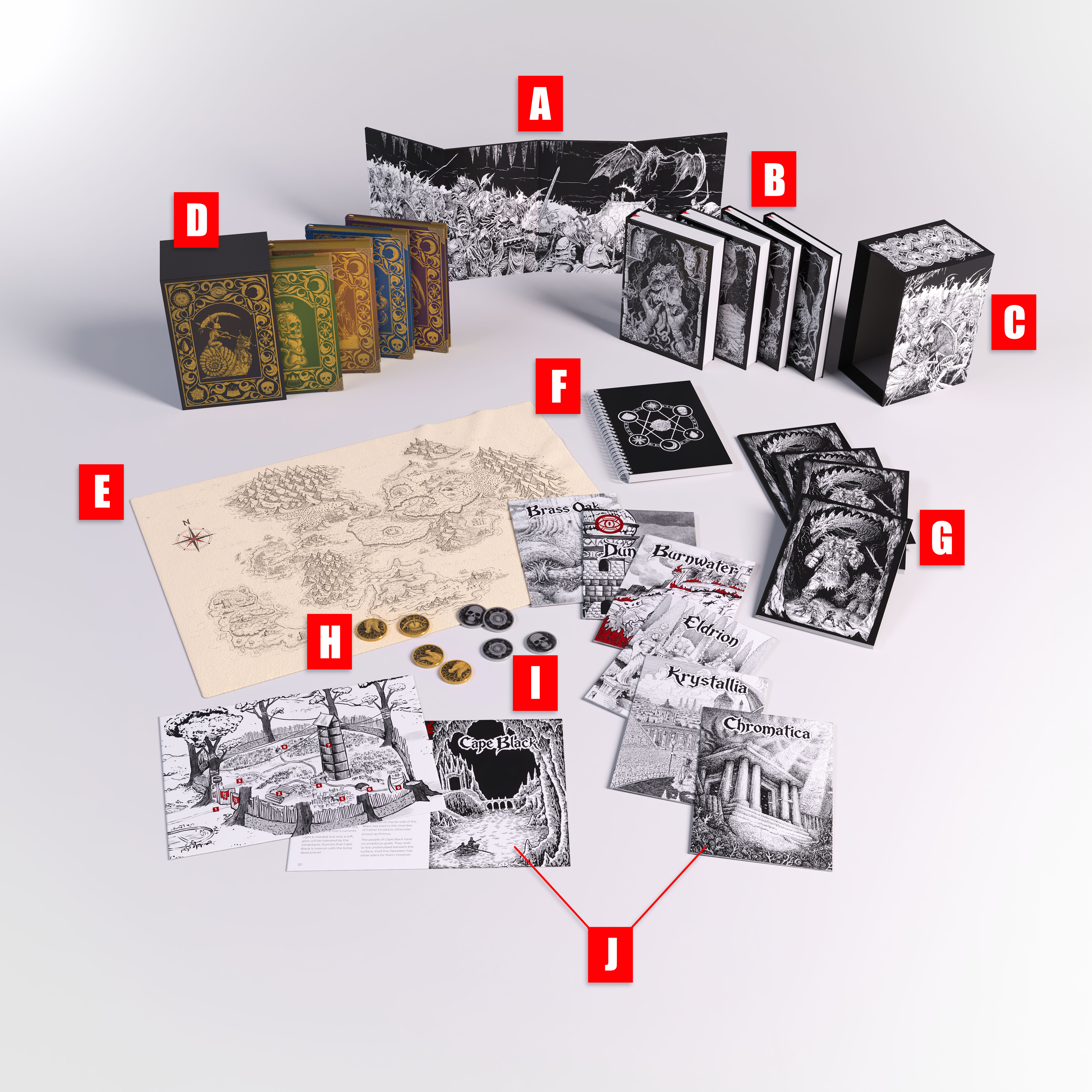 B: Druskara Standard Edition 4 Book Set – The complete four-volume campaign setting encompassing the realm, its factions, its powers, and its dungeons. Illustrated by Lucas Korte.