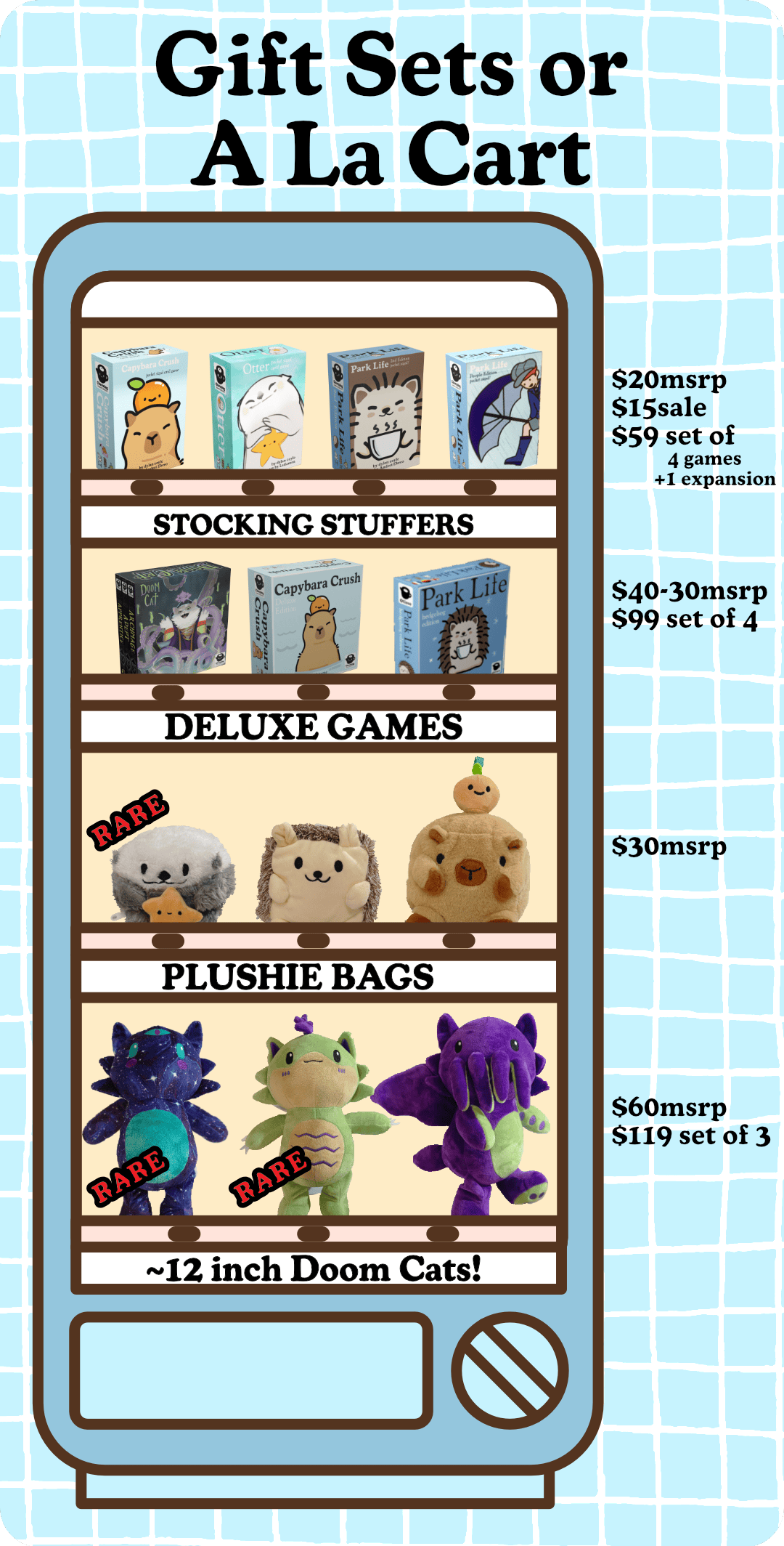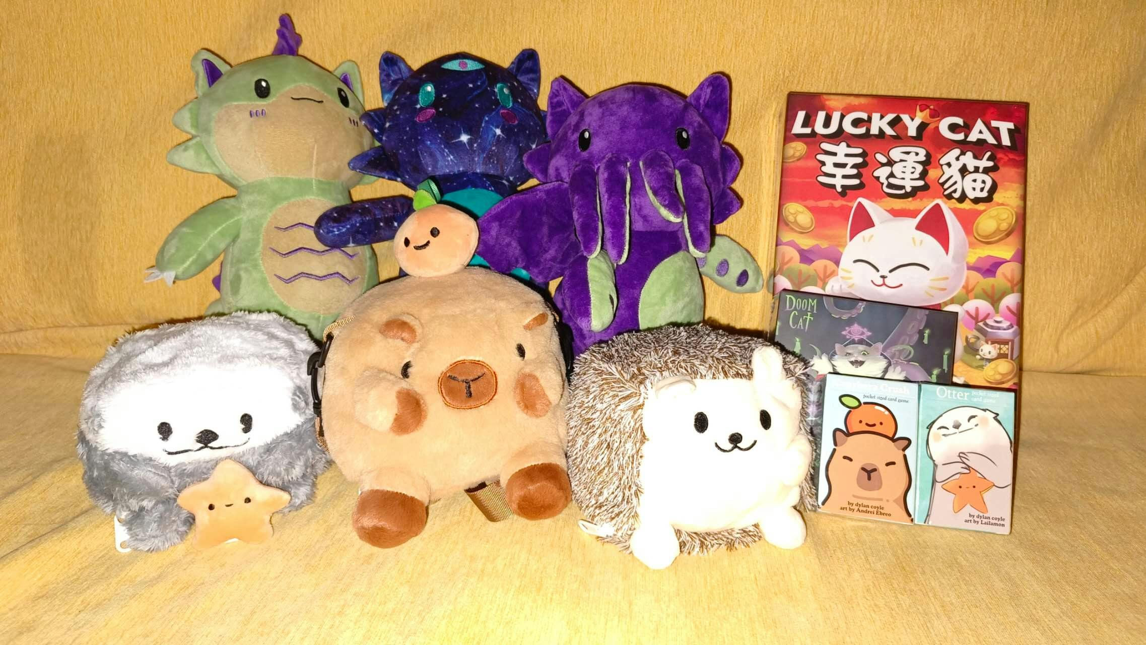 Shown above: Doom Cat plushies, plushie bags, Lucky Cat, Doom Cat, Capybara Crush, and Otter!