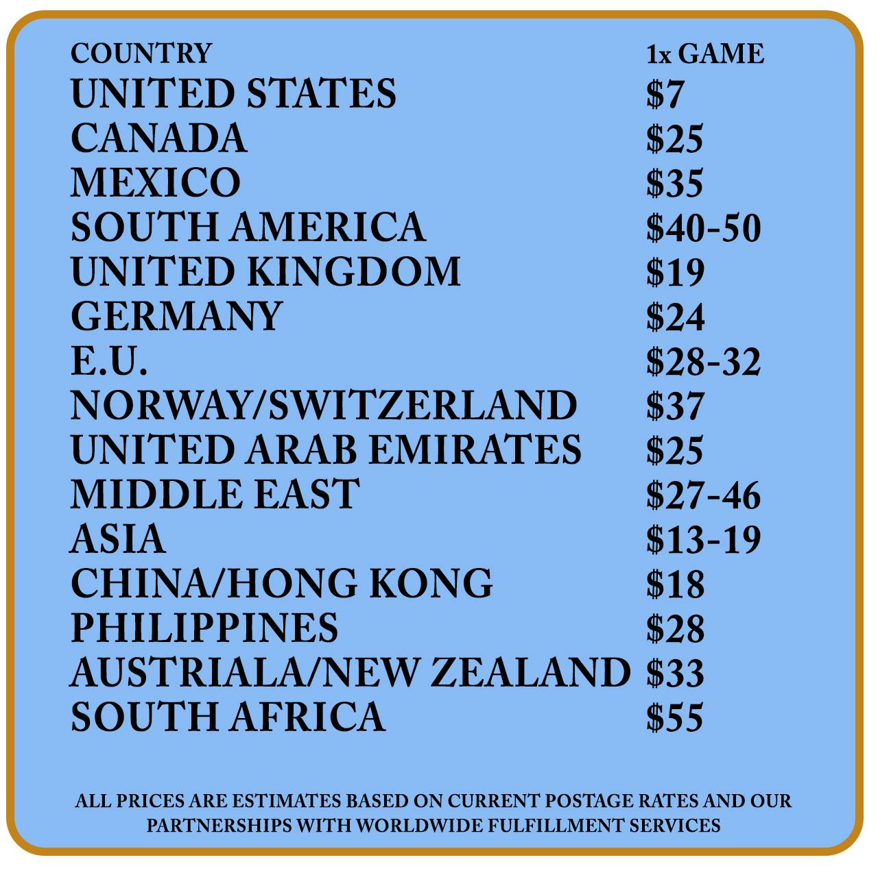 We are working with worldwide fulfillment companies to help lower your shipping costs for non-U.S. backers. This chart shows our most current rates. Please note that buyers will be responsible for applicable VAT charges for regions that require it as with any international purchase.