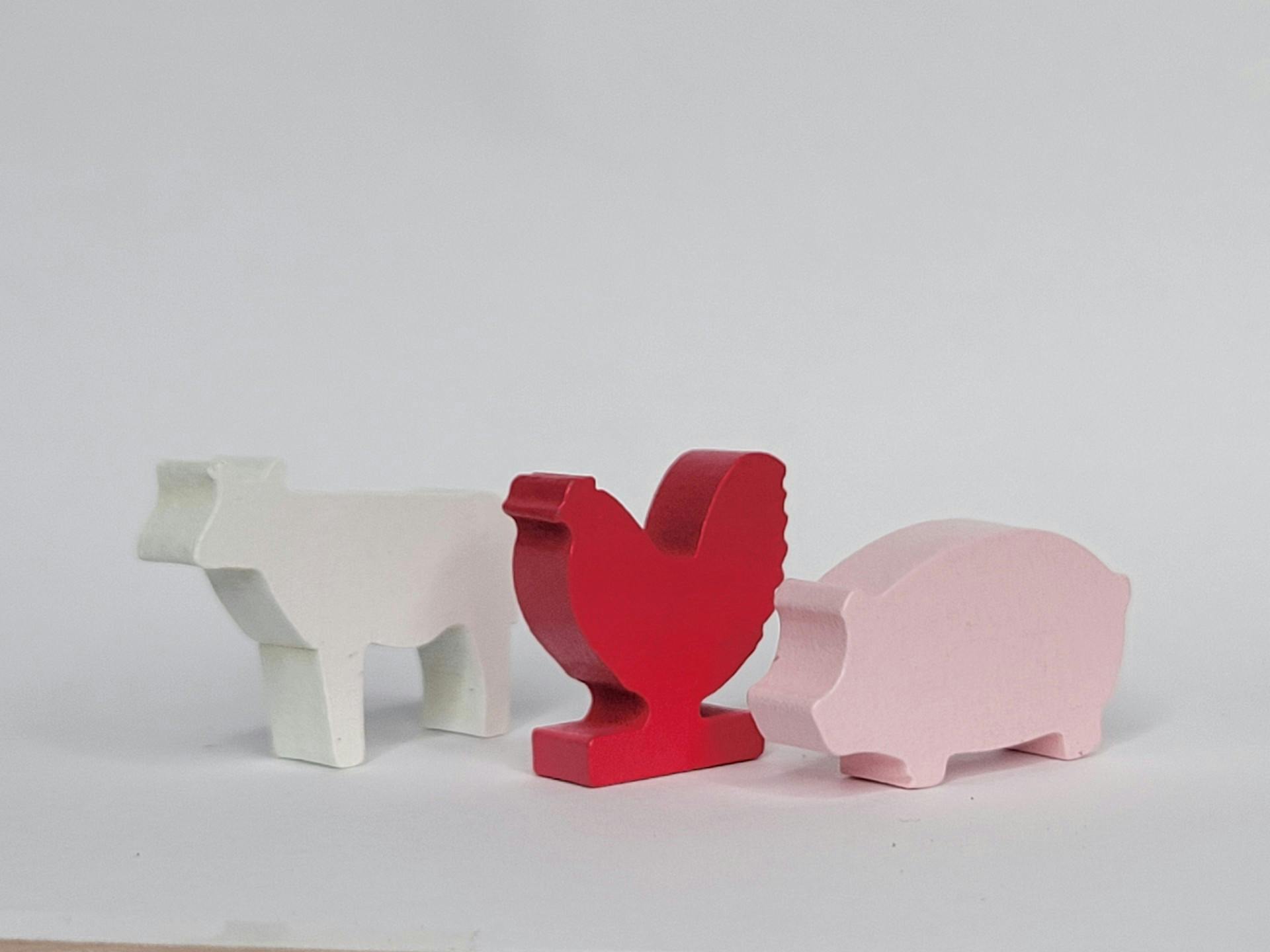 With the Monty Python and the Holy Grail game prototypes in hand, we're excited to share some photos of the components with you. When we were able to pry the catapult out of our game testers' hands, we grabbed the livestock meeples to share with everyone. Here's a peek at the critters you can fling in your opponent's general direction.