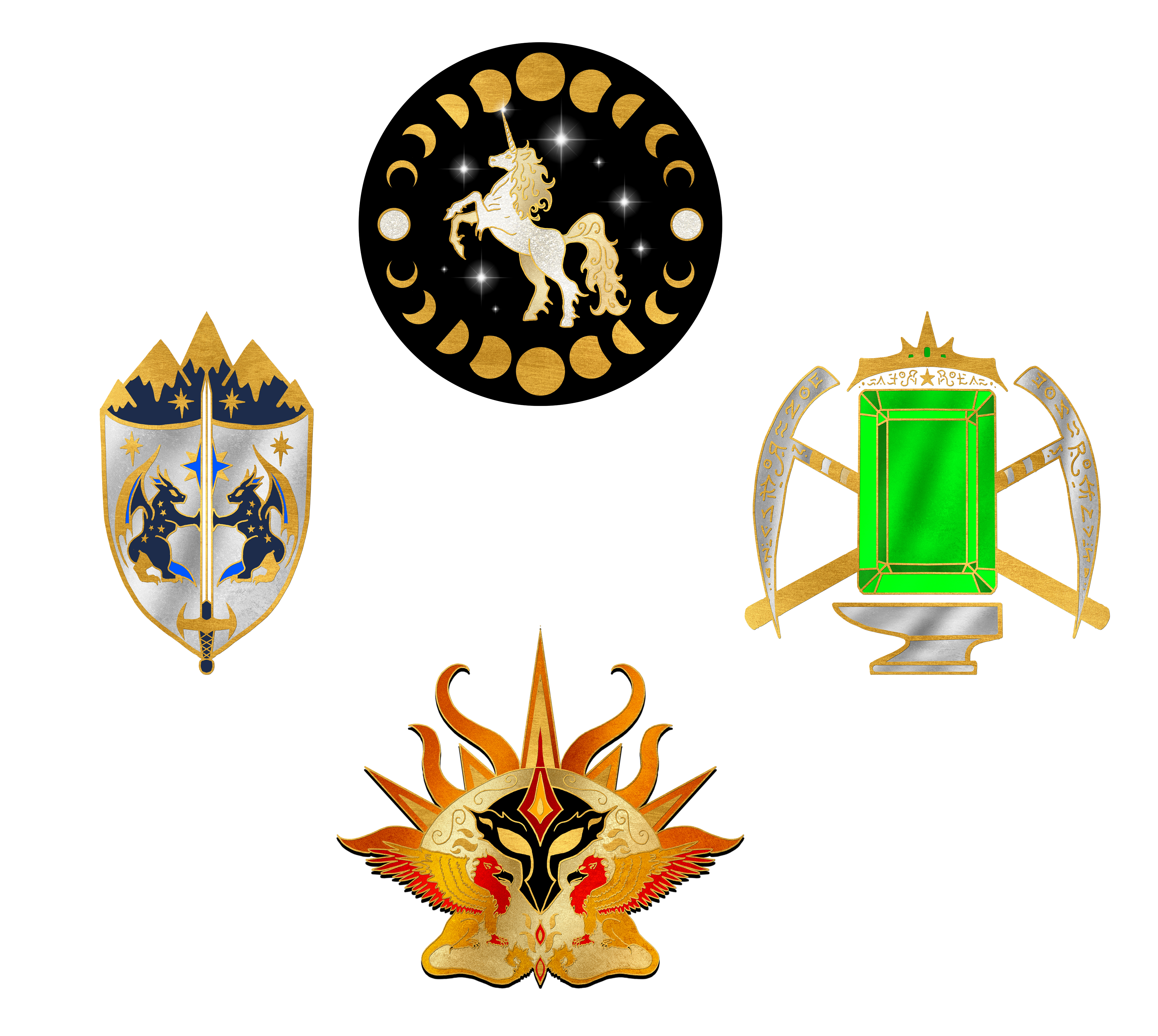 Bring the prophecies of The Lost Fae Queen trilogy to life with a set of collector quality hard enamel pins. Rethys, the green dragon; Dubhar, the black unicorn; and Asteria, a bronze griffin.