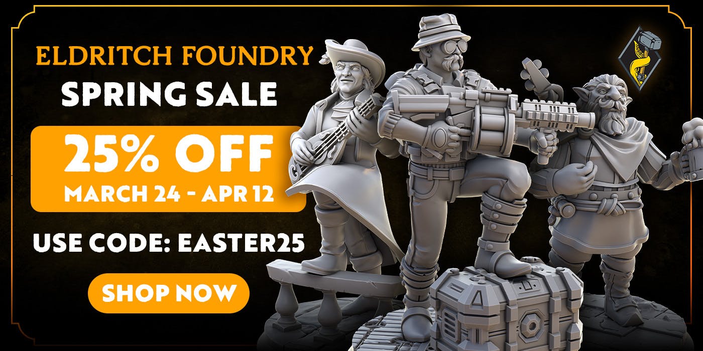 Planning to take your party into Spawns of the Mindrender? Eldritch Foundry’s Easter Sale can help you get table-ready: 25% off physical + digital minis with code EASTER25. Build the heroes, the allies, and the creatures your players should never meet alone.