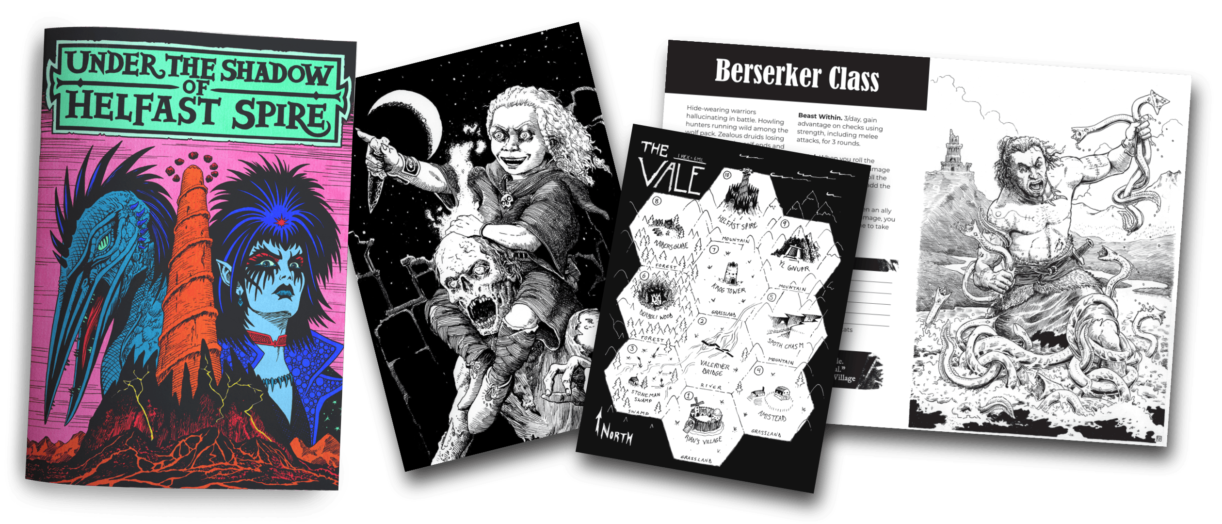 Under the Shadow of Helfast Spire is a zine of new material designed for Shadowdark RPG, by Bob World Builder! Inspired by binge-reading pulp fantasy novels, this 64-page zine includes the following: