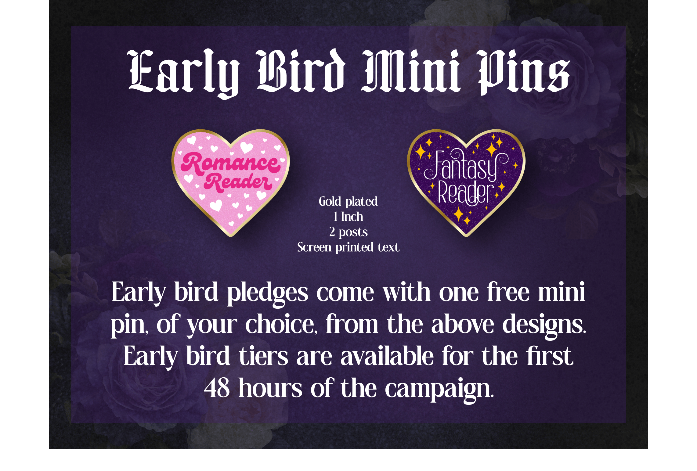 Early Bird Pledge Levels Early Bird pledge levels are only available for the first 48 hours of the campaign! Early bird backers will receive one free extra pin with their pledge level. The free pin can be selected from any of the unlocked designs.