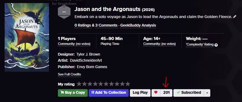 If you have not yet done so, venture forth to Board Game Geek and become a fan of Jason and the Argonauts by clicking the heart.