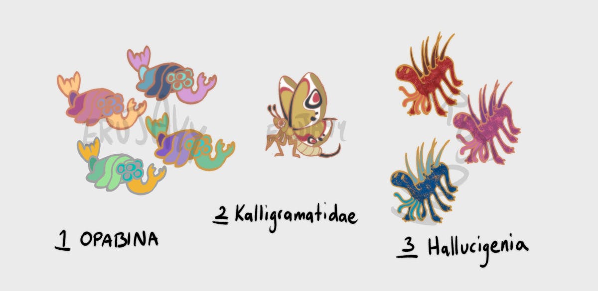 OPABINIA - From the Cambrian period, about 10cm in length with one grabby tentacle. KALLIGRAMATIDAE - From the Jurrasic period. They are lacewings who might as well have been the very first butterflies. HALLUCIGENIA - From the Cambrian period, they are the ancestors of velvet worms, and scientists have debated whether they're reading the fossils upside down or not.