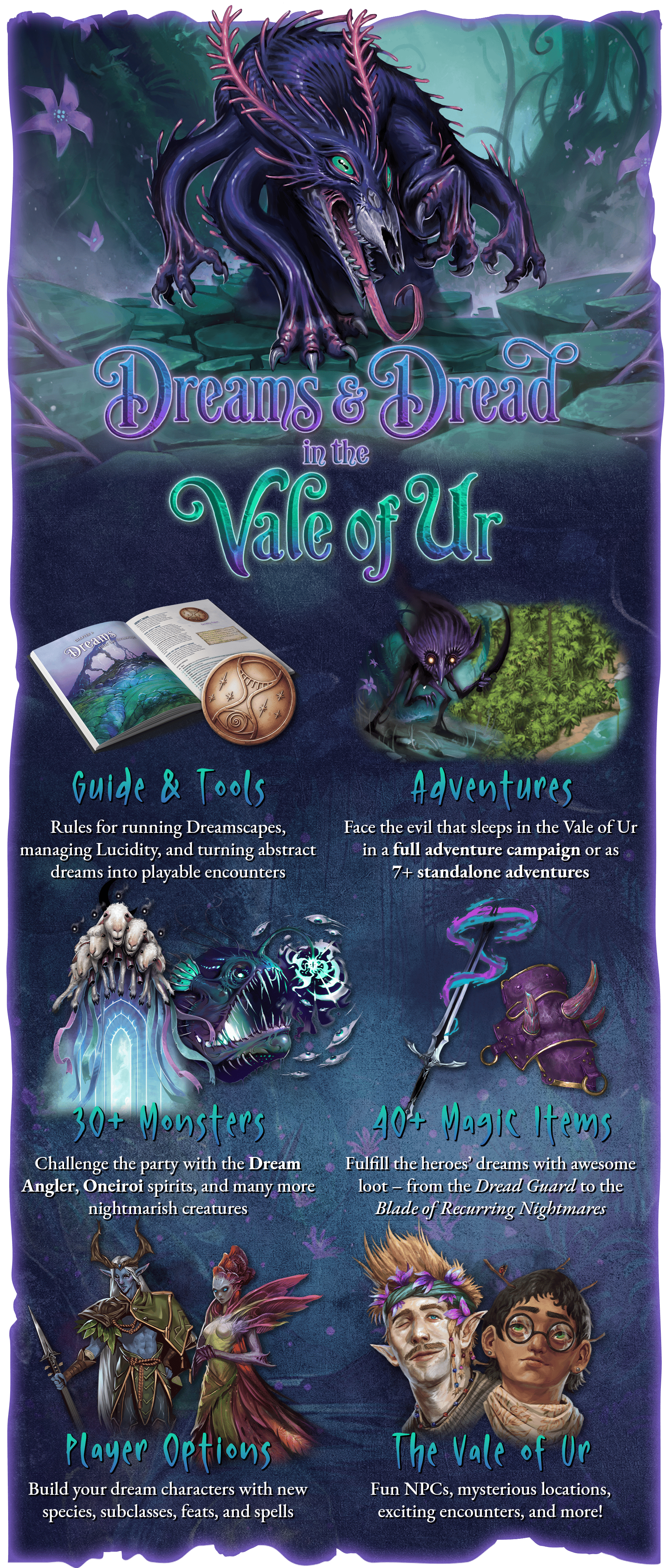 Explore the primordial Vale of Ur in an exciting campaign that takes the party from level 2-10, or run the 7+ quests as standalone adventures. To make their biggest dreams come true, the party must face their worst nightmares – and survive!
