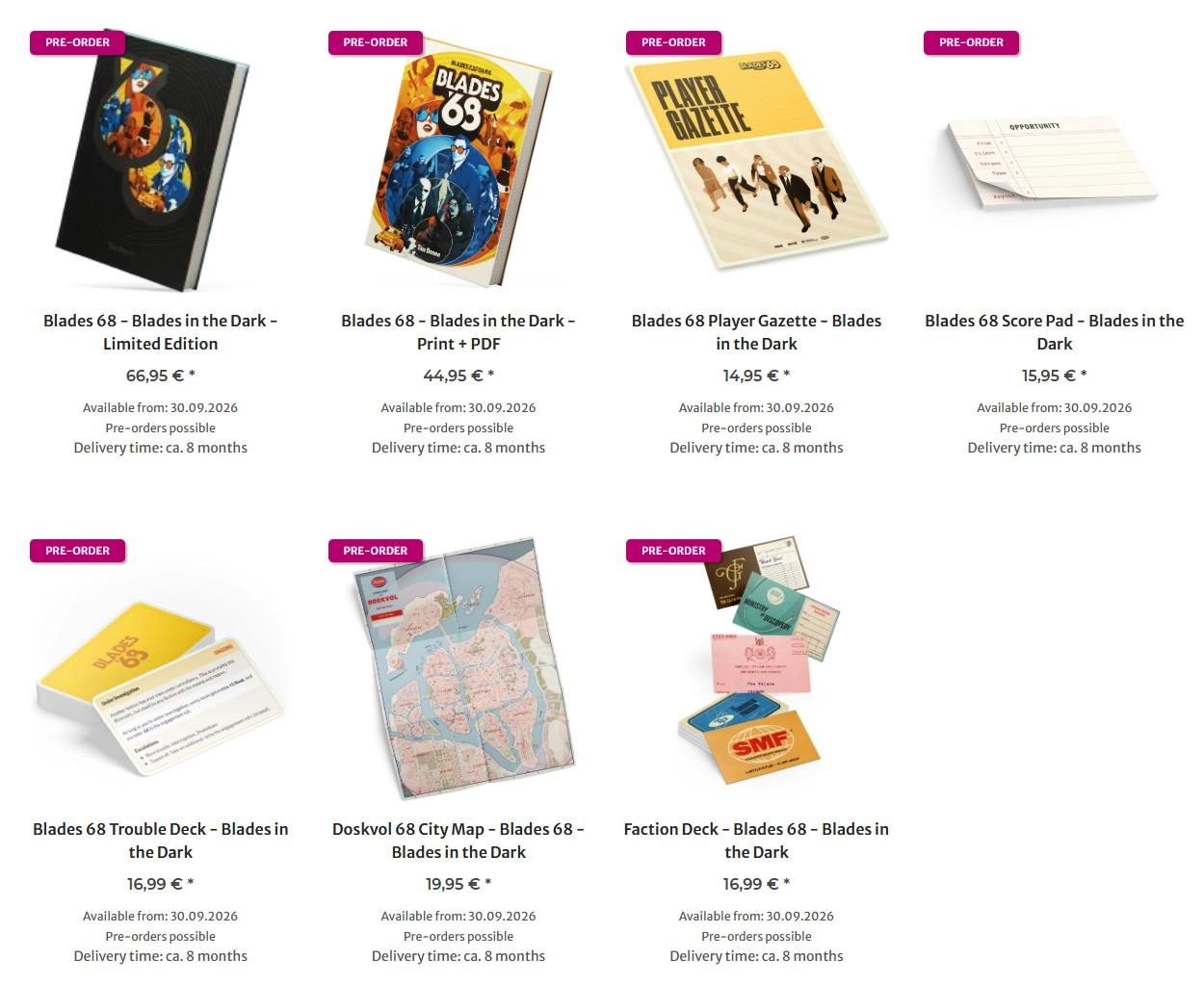 If you are in the EU, this is the best way to get copies of the Limited Edition rewards. Several of these items (like the Doskvol 68 City Map, Score Pad, and Faction Deck) will not go into international distribution. Sphaerenmeister can only get them because they use a freight forwarding service.